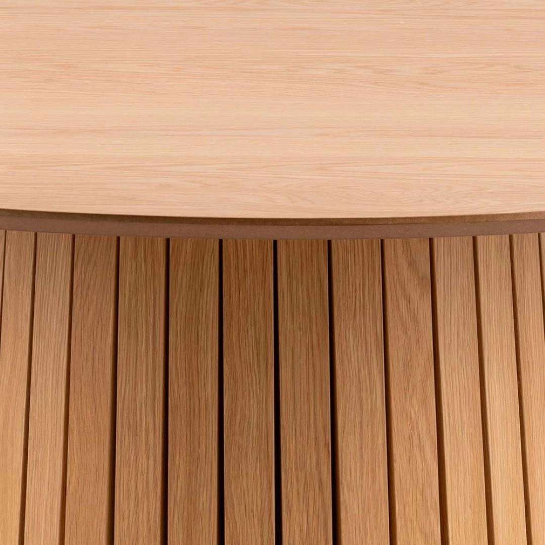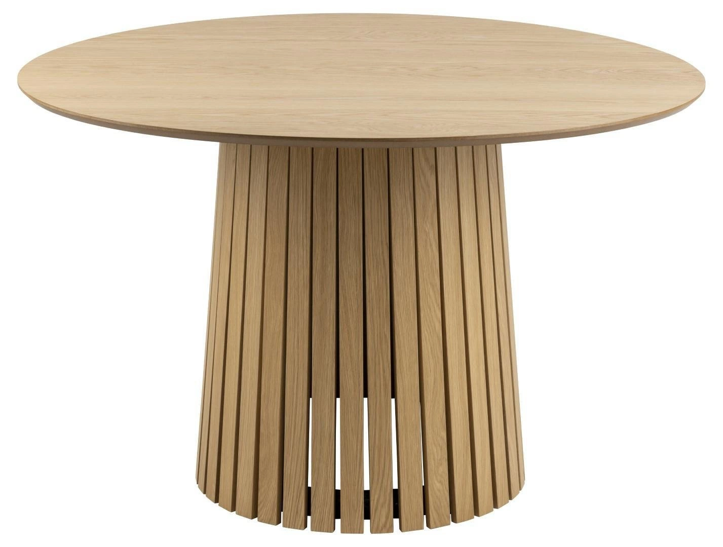 Netradiční základna na jedné noze umožňuje kolem stolu pohodlně rozmístit až pět židlí bez omezení typických pro klasické čtyřnohé stoly. Je to skvělá volba do menších místností, kde záleží na každém centimetru. Přírodní odstín dubové dýhy se snadno kombinuje s různými doplňky i dalším moderním, skandinávským nebo boho nábytkem.
