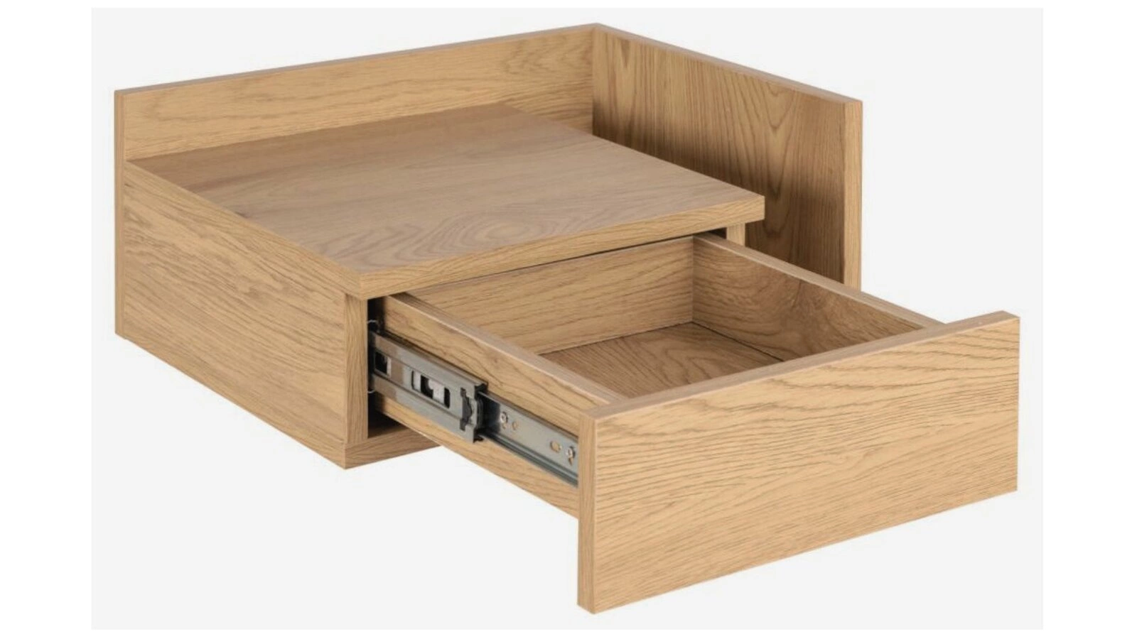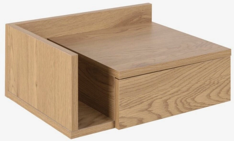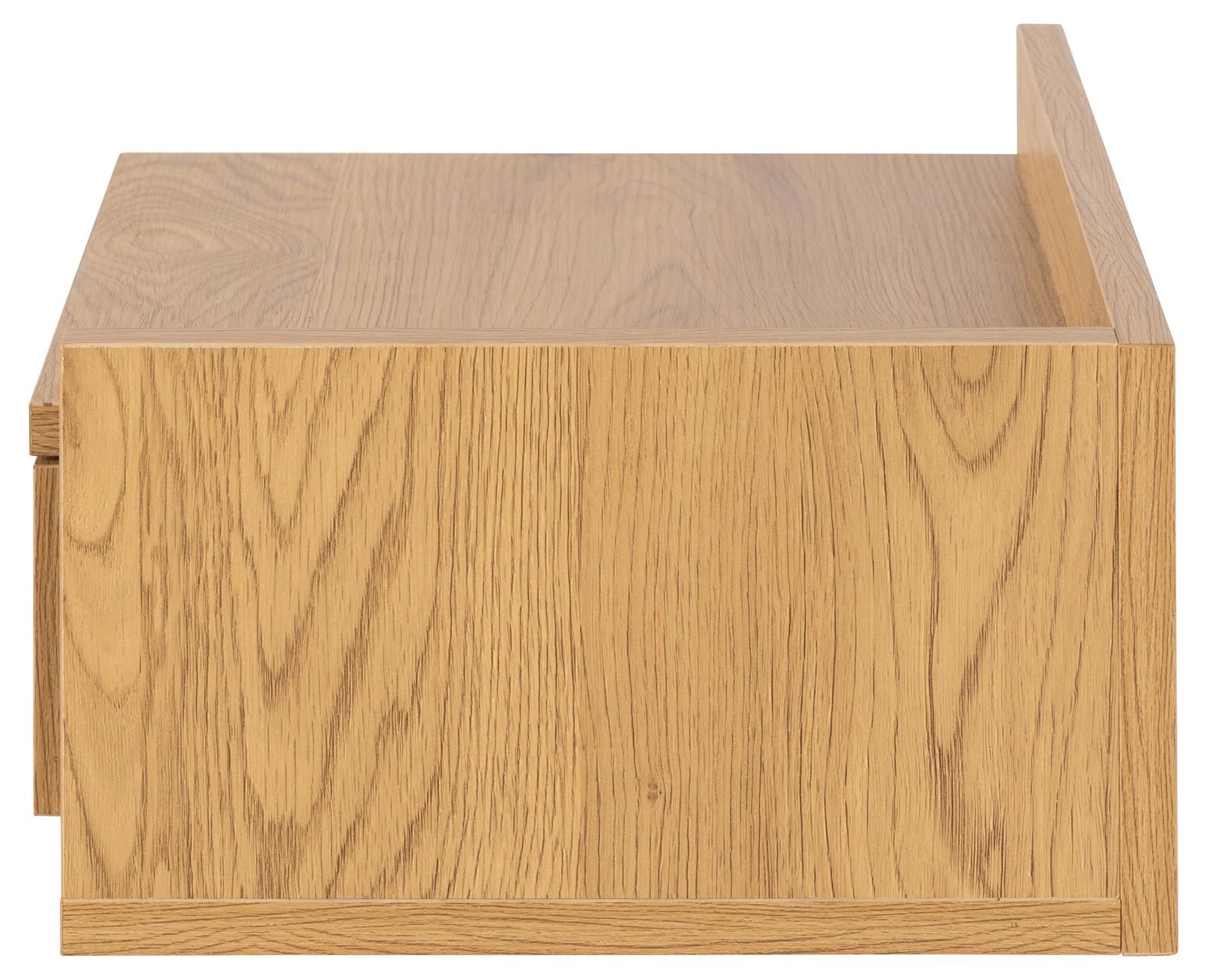 Závěsný noční stolek 40 cm dubový se zásuvkou Actona Ashlan II je moderním a praktickým doplňkem do ložnice, který spojuje minimalistický design s maximální funkčností. Vyrobený v přírodním odstínu dubu, vybavený prostornou zásuvkou a boční policí, je ideální jako závěsný noční stolek do ložnice. Se šířkou 40 cm a výškou 16,5 cm perfektně splní požadavky těch, kteří hledají kompaktní a stylové řešení pro uložení nezbytností u postele.