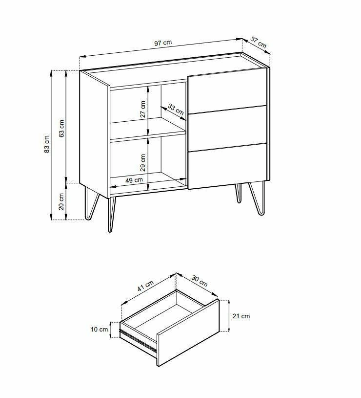 - Tři prostorné zásuvky a skříňka s policemi – snadný pořádek v obývacím pokoji nebo ložnici
