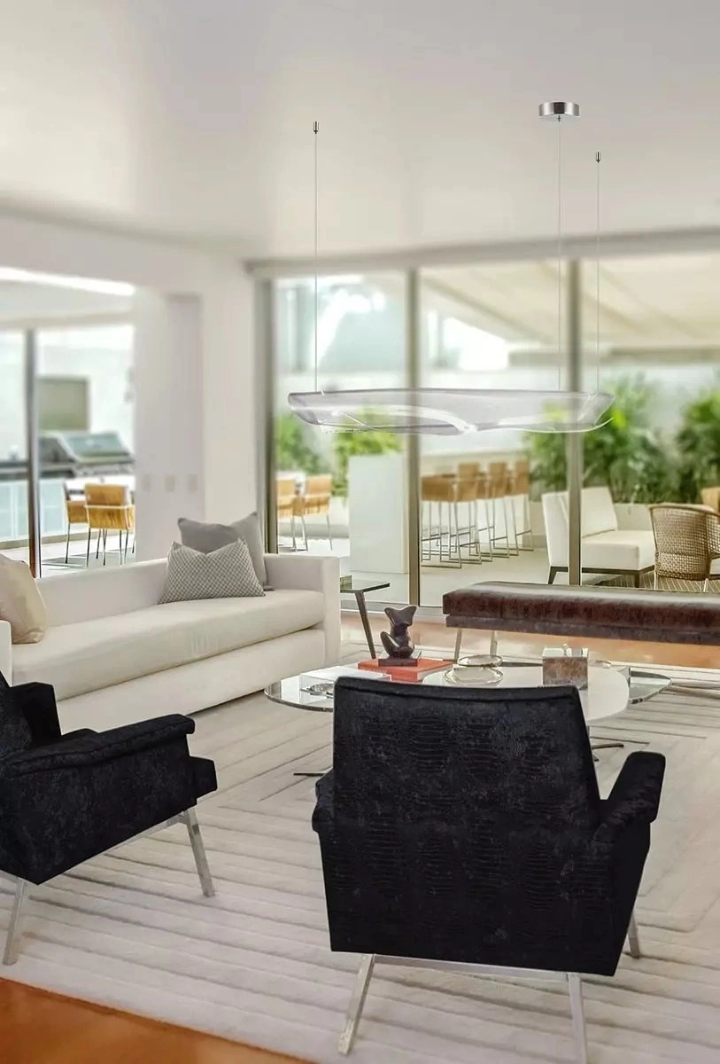 Závěsné LED svítidlo Cortina no. 3 od ALTAVOLA DESIGN je moderním řešením pro obývací pokoj, jídelnu nebo nad jídelní stůl – spojuje výrazný design s praktičností. Chromované detaily a transparentní prvky dodávají lampě osobitý, a přitom jemný charakter. Model nabízí nastavitelnou výšku zavěšení (až do 150 cm) a šířku 138 cm, což umožní perfektně přizpůsobit osvětlení Vašim potřebám.