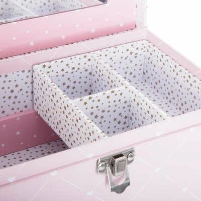 Skříňka na šperky je ideálním dárkem pro dospívající dívku, která miluje drobnosti a chce je mít uspořádané na jednom místě. Má mnoho přihrádek různých velikostí. Uvnitř skříňky je na víku umístěno velké obdélníkové zrcátko, které bude užitečné při zapínání náhrdelníku nebo nasazování náušnic.