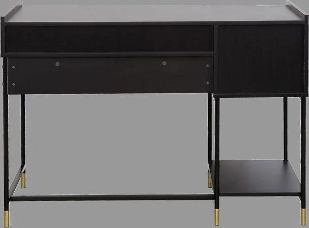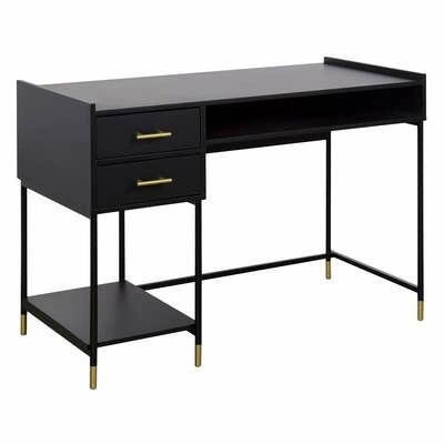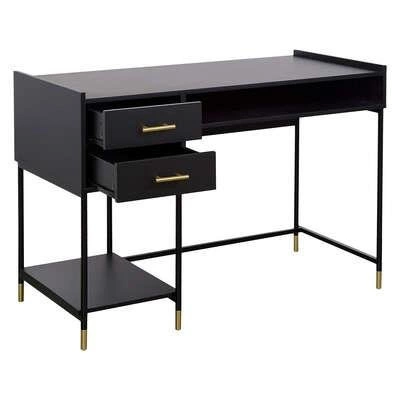 Pracovní stůl Tedy od značky Atmosphera je moderní loftový nábytek o šířce 110 cm, vyrobený z kombinace černé desky a kovové konstrukce se zlatými akcenty. Je vybaven dvěma praktickými zásuvkami a dvěma otevřenými policemi, což z něj činí ideální volbu do kanceláře, ložnice nebo obývacího pokoje. Díky kompaktním rozměrům a promyšlené funkčnosti je perfektní jako stůl do domácí pracovny, místo pro studium nebo práci z domova.