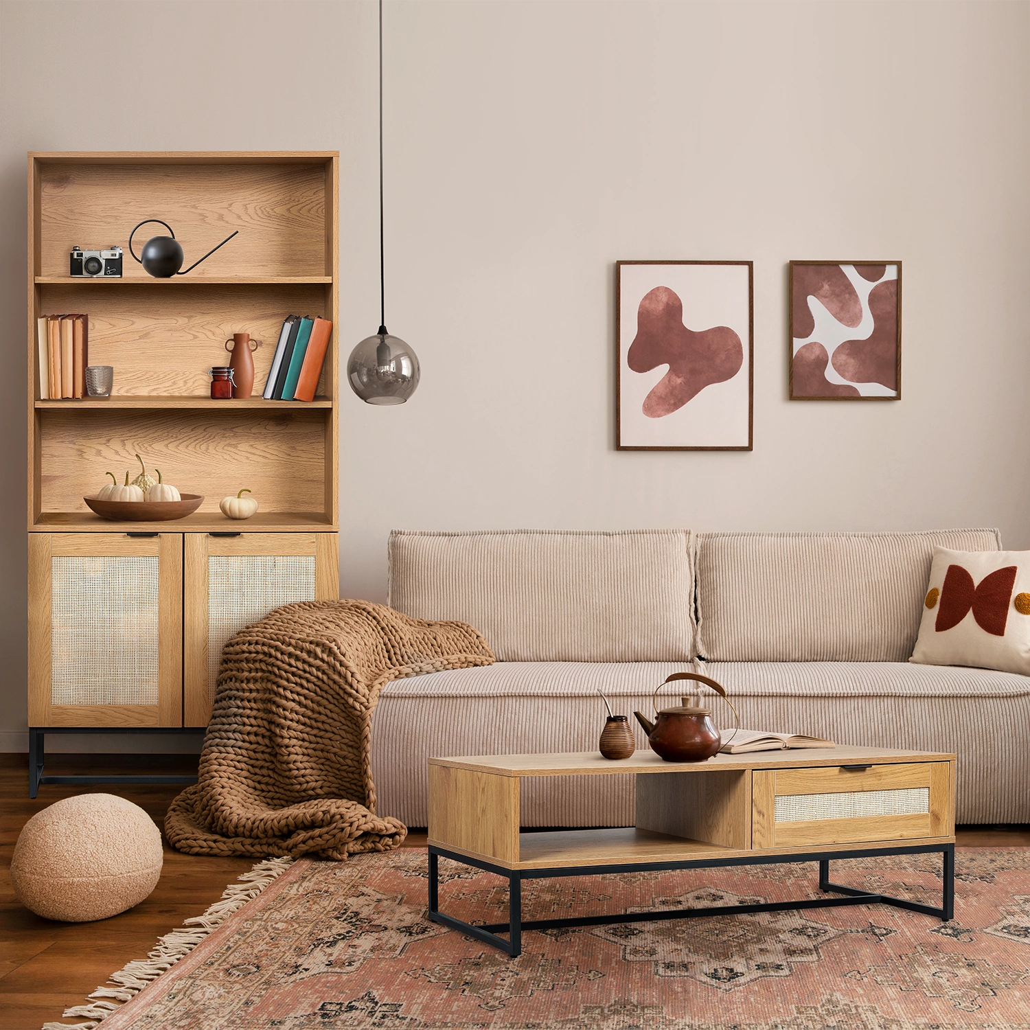 Konferenční stolek Capri není jen praktickým kusem nábytku, ale také stylovou dekorací, která do prostoru vnese útulnou atmosféru přírody. Deska v přírodním odstínu a jemné dřevěné struktuře dokonale ladí s čelem z ručně pleteného ratanu. Právě tento detail dodává stolku jedinečný charakter a vnáší do interiéru lehkost a teplo. Konferenční stolek Capri vynikne mezi pokojovými rostlinami, měkkými textiliemi a světlými doplňky.Funkčnost a pohodlí pro každý den