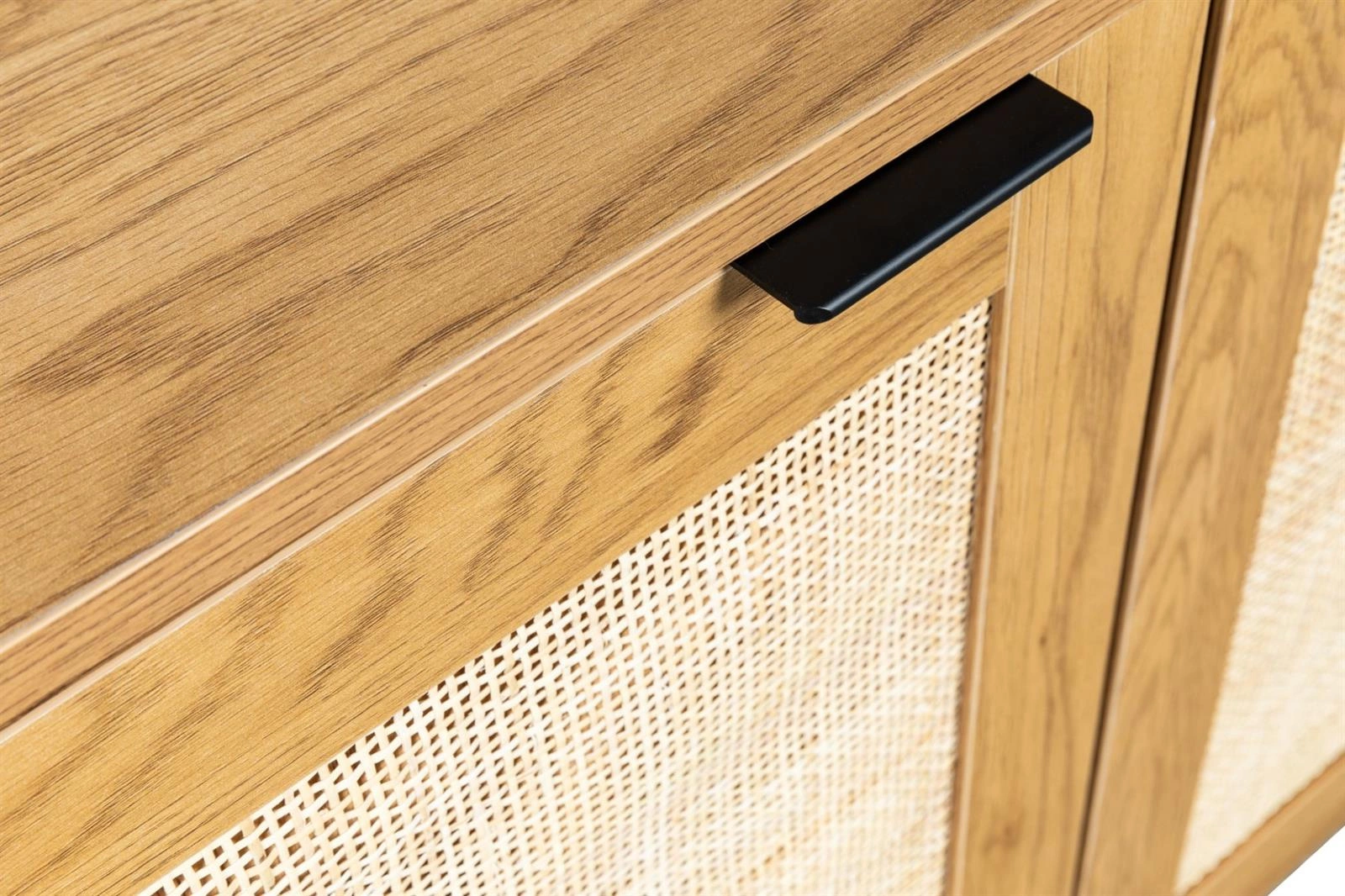 Přední části z přírodního ratanu vytvářejí jedinečnou atmosféru interiéru, přinášejí útulnost a vzdušnost typickou pro boho styl. Štíhlé černé kovové nohy dodávají nábytku moderní vzhled a jemnou eleganci. Díky tomu se komoda skvěle hodí jak do světlých, minimalistických interiérů, tak do eklektičtějších prostor. Kombinace těchto materiálů a barev vytváří harmonii a svěžest, která vynikne v každé moderní domácnosti.