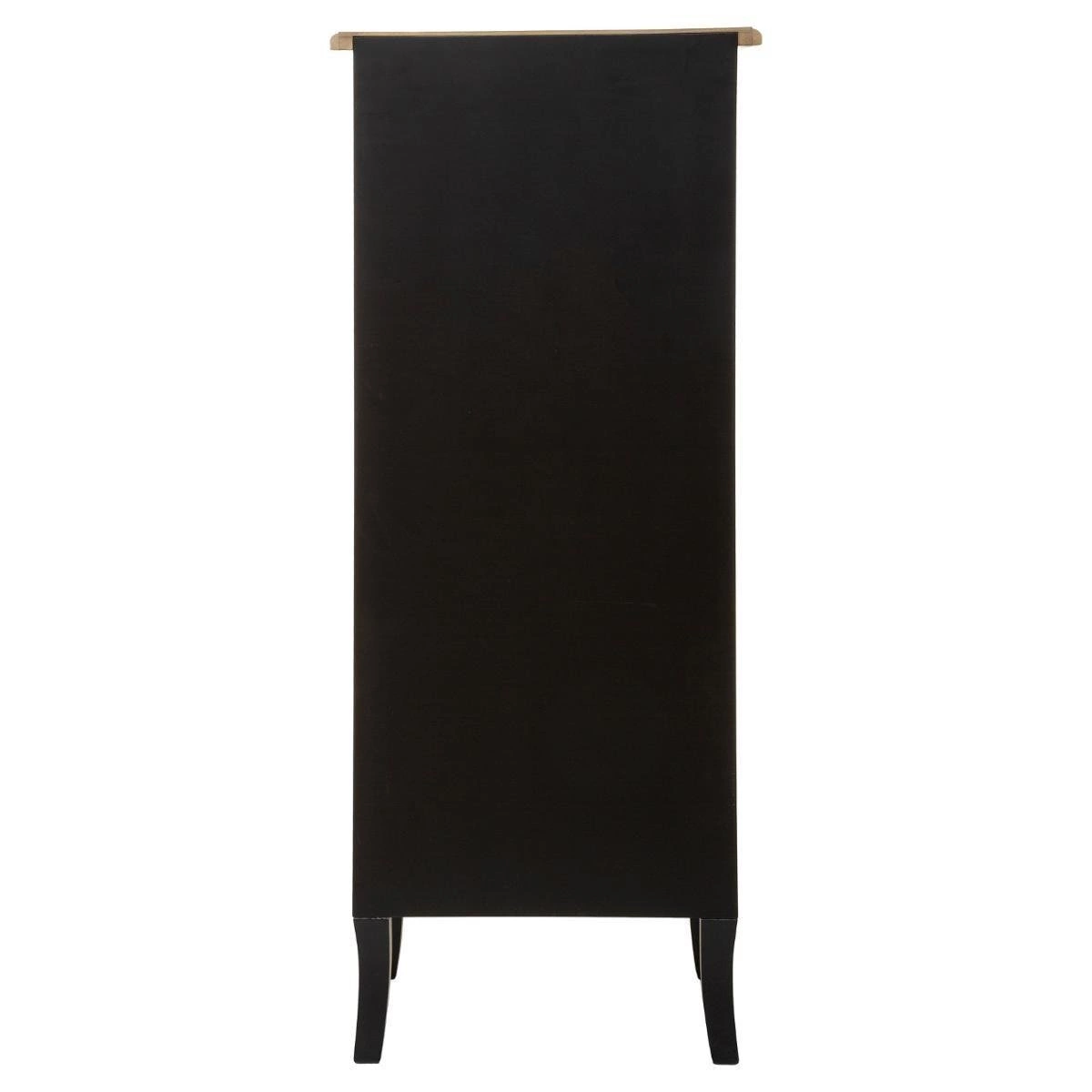 Vysoká komoda s 5 zásuvkami je ideální do ložnice nebo předsíně. Černá komoda s horní deskou v barvě dřeva je mimořádně prostorný kus nábytku. Pět zásuvek o rozměrech výška: 15 cm, šířka: 32 cm a hloubka: 24 cm pojme spodní prádlo, šátky, klobouky, kosmetiku nebo jiné praktické věci.
