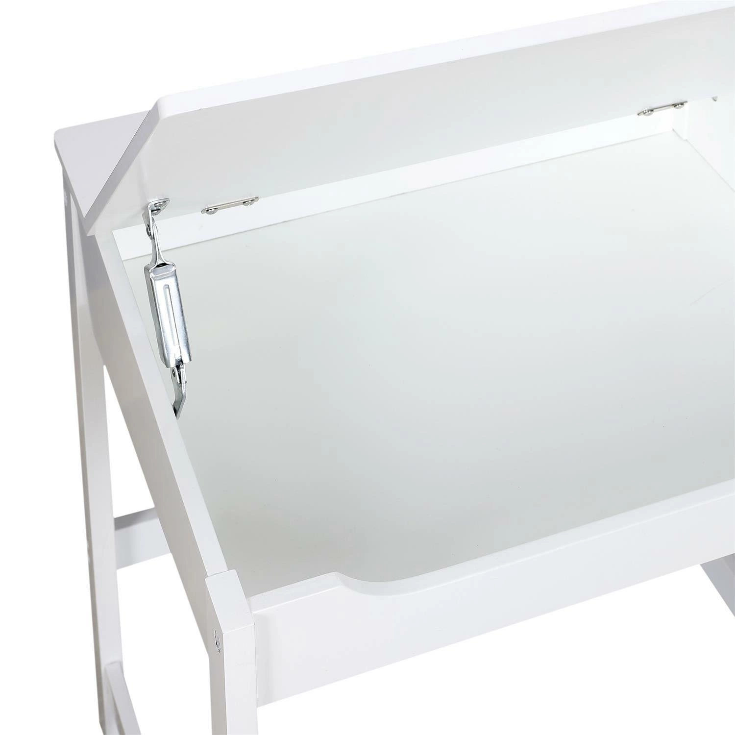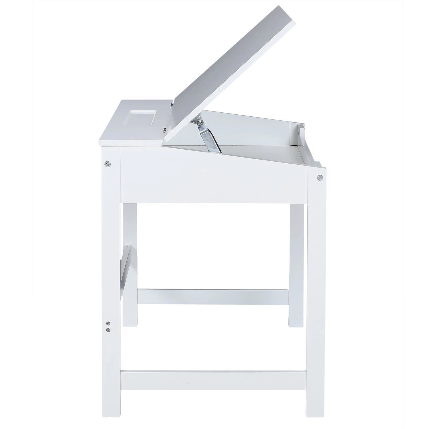 Bílý dětský psací stůl s úložným prostorem pod horní deskou je ideálním kusem kreslícího nábytku pro nejmenší. Bílý dřevěný psací stůl je vysoký necelých 50 cm a jeho deska je pro děti ve správné výšce. Dětský kreslící stolek má odklápěcí desku a pod ní úložný prostor. Do úložného prostoru lze uložit pastelky, fixy nebo papír na kreslení.Rozměry: 52x11x65 cm. Nábytek vyžaduje montáž. Hmotnost: 6,5 kg