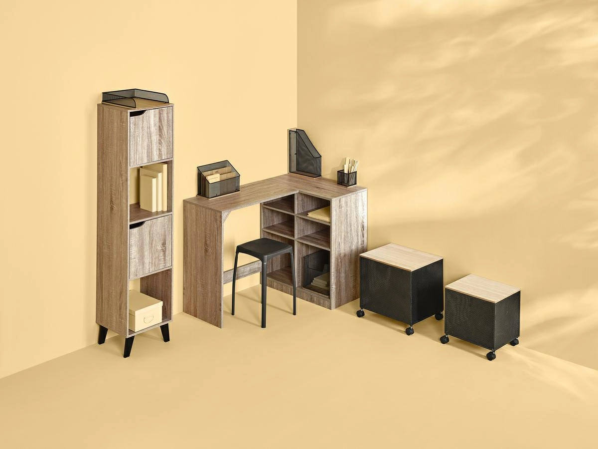 Knihovna Ceda ze stejnojmenné kolekce je elegantní kus nábytku ideální do každé domácnosti. Má poutavý design s černými šikmými nohami, které krásně kontrastují s povrchovou úpravou z dubové dýhy. Knihovna je vyrobena z MDF s realistickým vzhledem dubu a nabízí cenově dostupnou alternativu k nábytku z masivního dřeva. Knihovna nabízí dvě skříňky se stylovými vyfrézovanými výřezy místo klasických úchytek, které umožňují snadný přístup ke všem vašim cennostem.