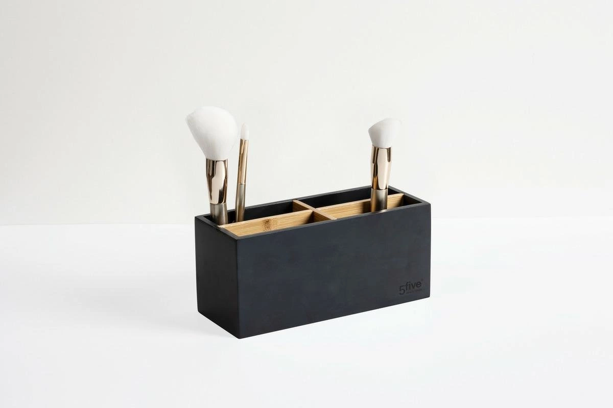 Organizer na kosmetiku do koupelny Natureo od značky 5five simply smart je stylový a praktický box vyrobený z přírodního bambusového dřeva v elegantním černém matném provedení. Čtyři přihrádky umožňují přehledně uspořádat oblíbené kosmetické produkty nebo make-up doplňky, takže udržení pořádku na toaletním stolku, v koupelně nebo na pracovním stole je opravdu snadné. Díky kompaktní šířce 20 cm se organizer snadno vejde i na menší polici či desku a zajistí pohodlný přístup k nejdůležitějším drobnostem.