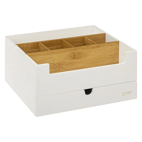 Organizer na kosmetiku Natureo bambusový s zásuvkou a přihrádkami bílý od značky 5five simply smart je stylové a praktické řešení do koupelny, ložnice nebo na toaletní stolek. Vyrobený z přírodního bambusového dřeva, spojuje moderní skandinávský design s funkčností – šířka 26,2 cm a hloubka 24,1 cm poskytují dostatek místa pro všechny potřebné kosmetické produkty, zatímco promyšlené přihrádky a zásuvka pomáhají udržet dokonalý pořádek každý den.