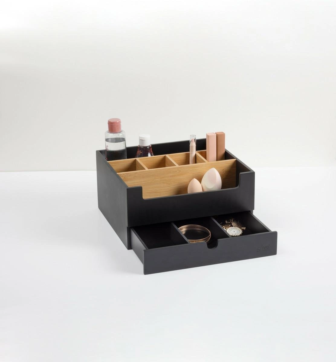 Bambusový organizér na kosmetiku Natureo černý se zásuvkou a přihrádkami je nejen praktickým pomocníkem pro uspořádání kosmetiky, ale také designovým prvkem, který zvýrazní moderní charakter vašeho interiéru. Výběrem značky 5five simply smart investujete do kvality, stylu a každodenního pohodlí.