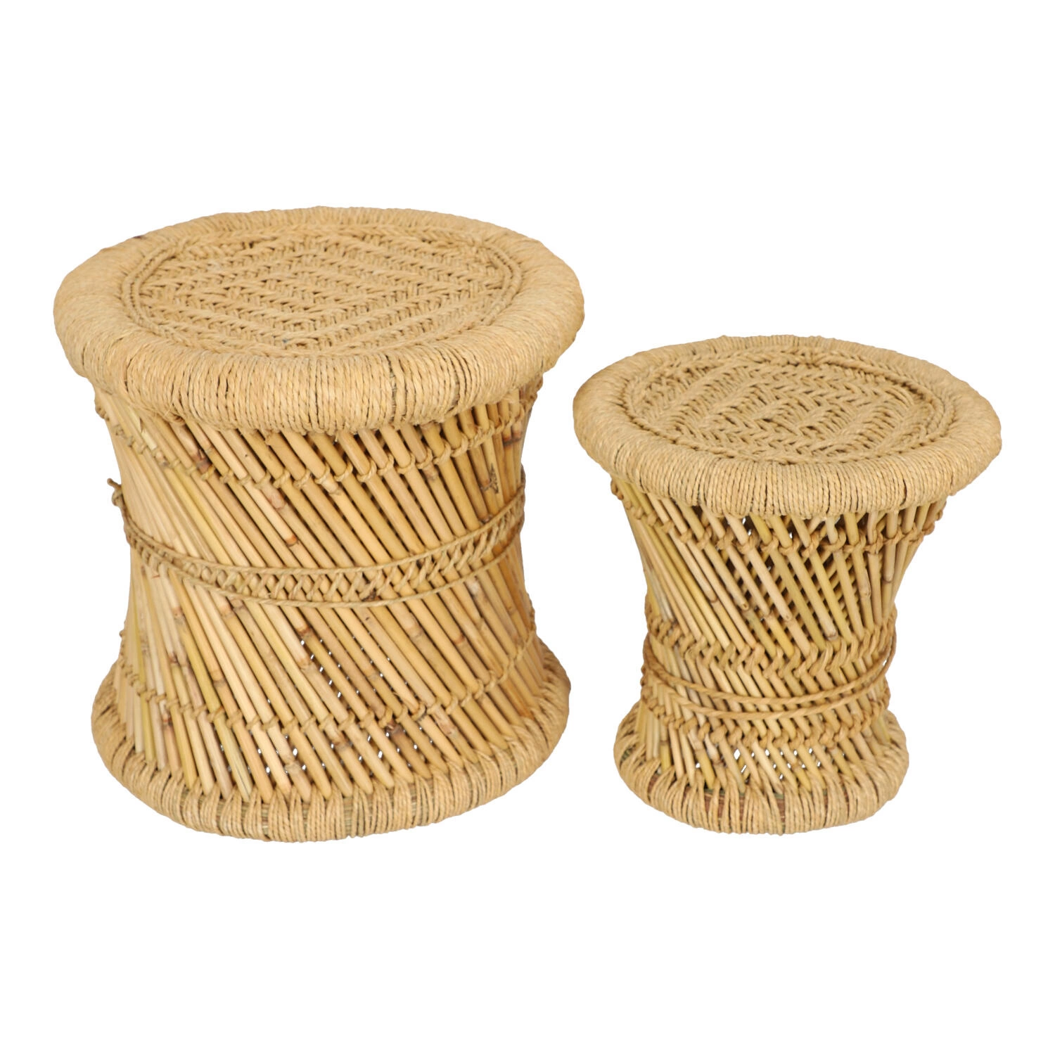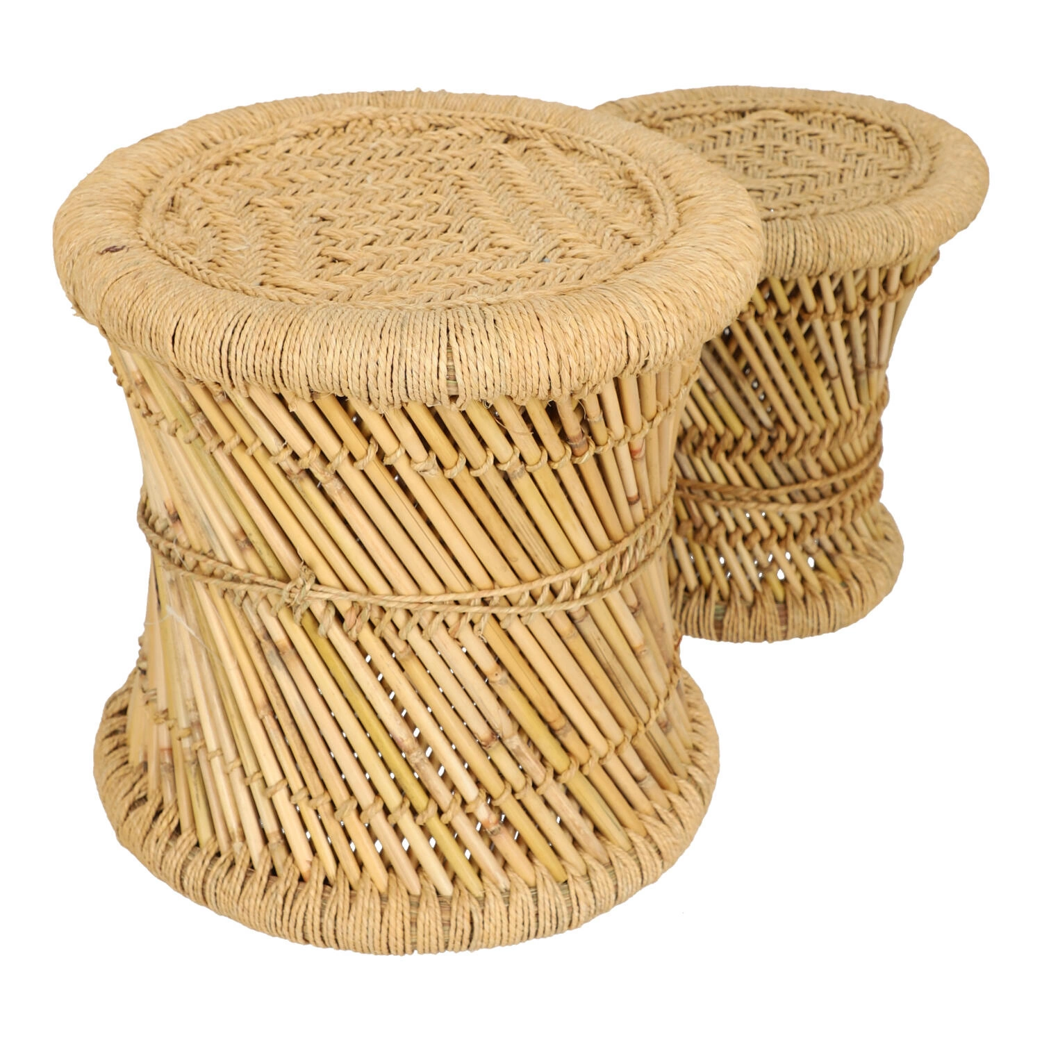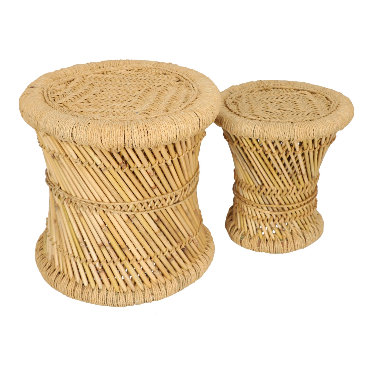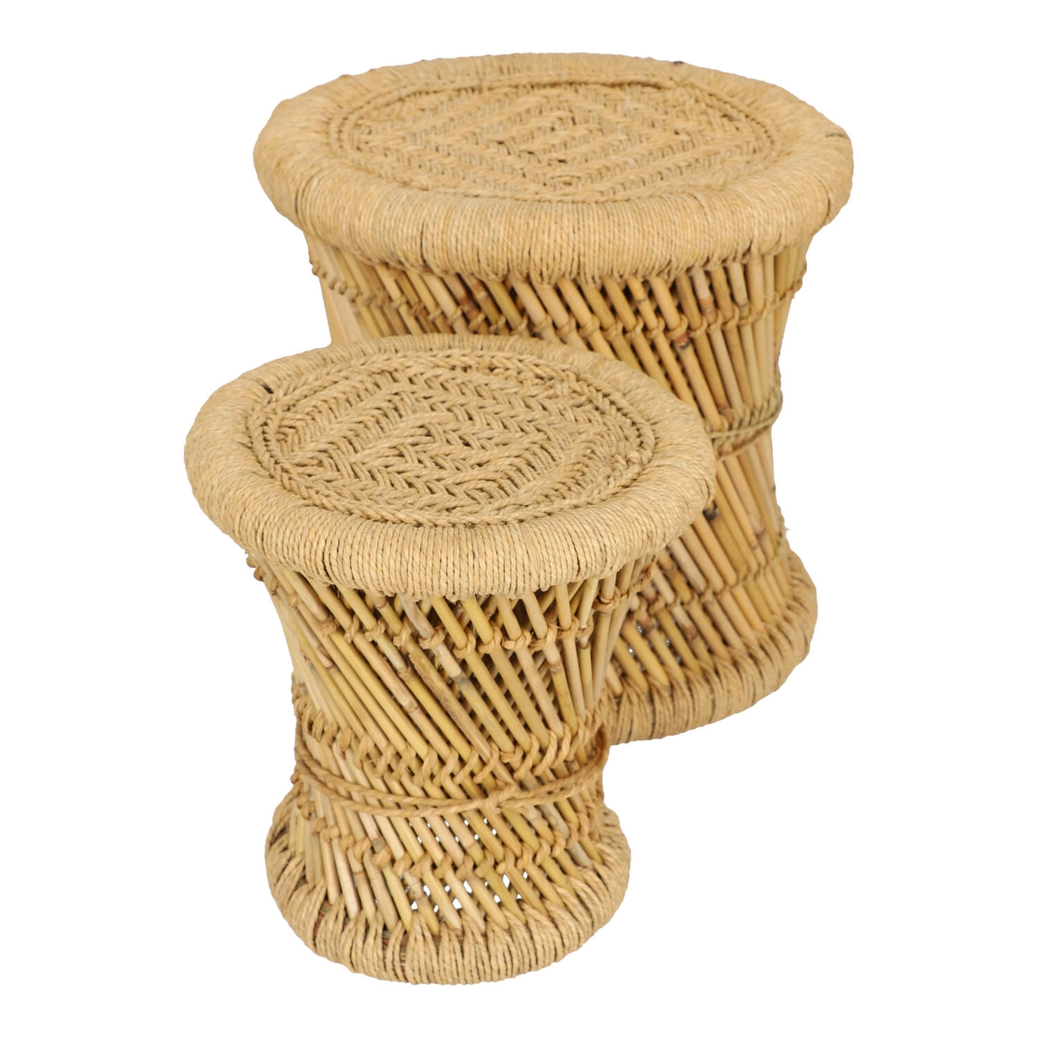 Sada 2 kulatých konferenčních stolků boho Corde z bambusu a konopí do obývacího pokoje Atmosphera – přírodní prvek v moderním interiéru