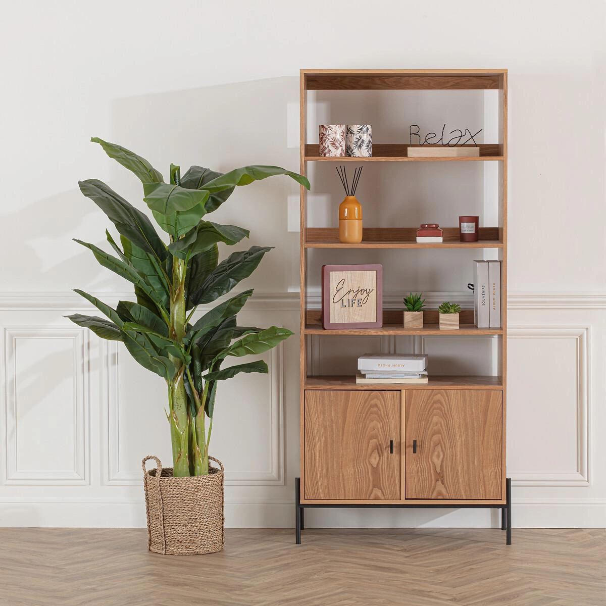 Knihovna Simon byla navržena pro ty, kteří si cení pořádku i estetiky. Čtyři otevřené police umožňují stylově vystavit sbírku knih, rámečky s fotkami nebo pokojové rostliny. Dvě spodní skříňky usnadní uložení drobností, které chcete mít po ruce, ale nechcete je mít na očích. Díky tomu snadno vytvoříte harmonický a uspořádaný interiér ve svém domově.
