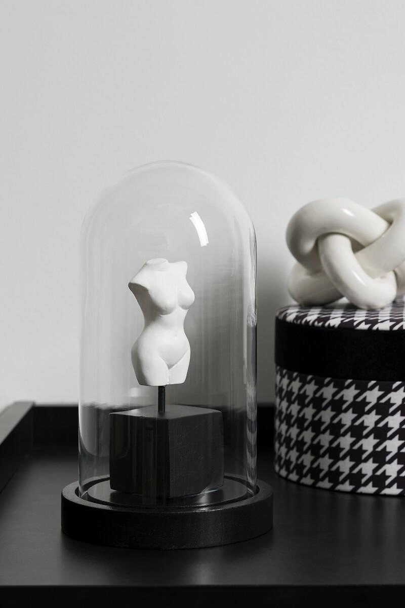 Dekorační figurka Afrodita pod sklem od značky Atmosphera je jedinečná ozdoba o výšce 21 cm, navržená pro interiéry ve stylu glamour. Precizně zpracovaná postava Afrodity, umístěná pod elegantní skleněnou kupolí, vytváří výrazný dekorativní prvek, který vynikne v obývacím pokoji nebo ložnici. Moderní design, kontrast černé a bílé a decentní lesk skla podtrhují luxusní charakter této ozdobné figurky.