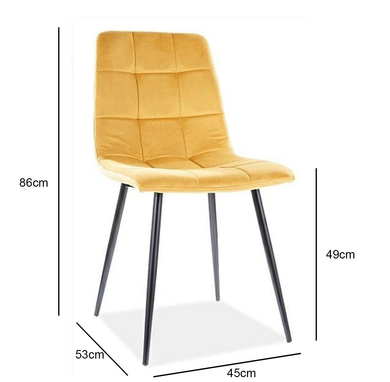 Židle Mello Intesi ve žlutém provedení vnáší do obývacího pokoje nebo jídelny energii a optimismus. Sametová látka Bluvel se krásně třpytí ve světle, dodává nábytku eleganci a hloubku. Kovové nohy v matné černé decentně kontrastují s čalouněním a podtrhují moderní charakter židle, která se hodí jak ke stolu ve stylu glamour, tak i do minimalistických aranžmá. Univerzální rozměry (šířka 45 cm, hloubka 53 cm, celková výška 86 cm) umožňují snadné začlenění židle k většině jídelních i kuchyňských stolů.