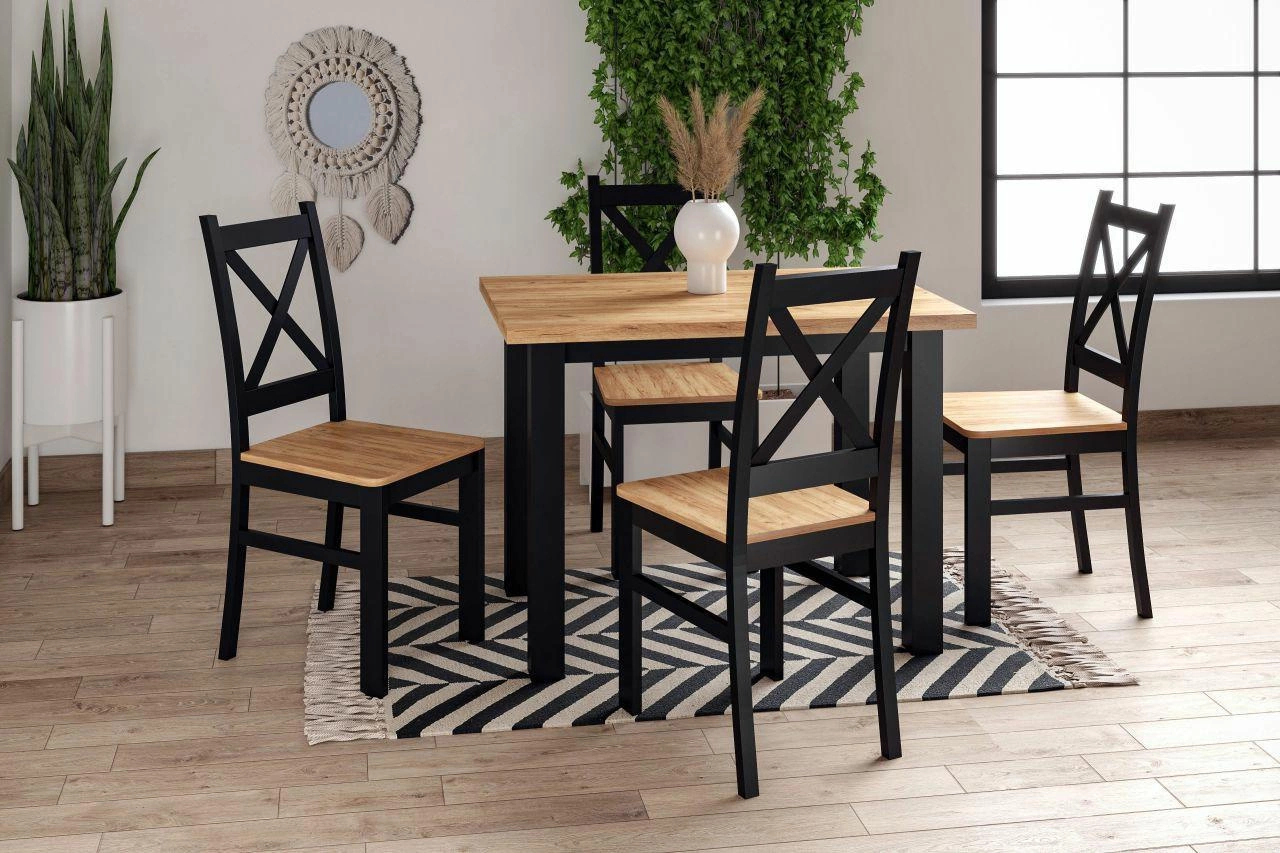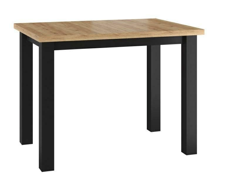 Jídelní stůl Ronda od značky Intesi je moderní kus nábytku s obdélníkovou deskou (100×70 cm), vyrobenou z MDF desky potažené dýhou v odstínu přírodního dubu. Čtyři pevné nohy z bukového dřeva v černé barvě dodávají stolu výrazný charakter a zajišťují stabilitu při každodenním používání. Tento nerozkládací stůl je ideální volbou nejen do jídelny, ale i do kuchyně či obývacího pokoje, kde se stane středobodem rodinných setkání a společných jídel.