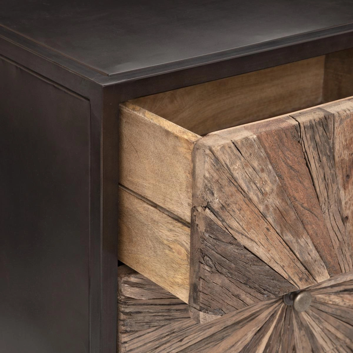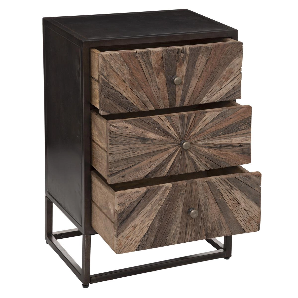 Komoda Origins se 3 zásuvkami je stylový a originální kus nábytku. Černá kovová základna i korpus z překližkových desek jsou šetrné k životnímu prostředí, zatímco jedinečná čela komody jsou vyrobena z recyklovaného dřeva. Tato jedinečná komoda dodá charakter každé místnosti.