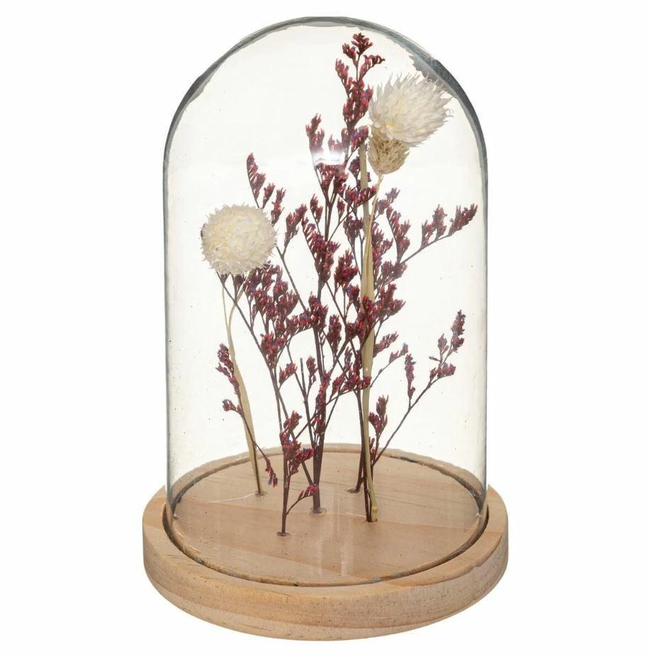 Kompozice sušených květin podskleněným stínidlem je krásnou a zajímavou dekorací pro každý přírodní interiér. Dekorace umístěná na dřevěném podstavci je vyrobena ze sušených rostlin a skla a jejíhmotnost je 0,307 kg.