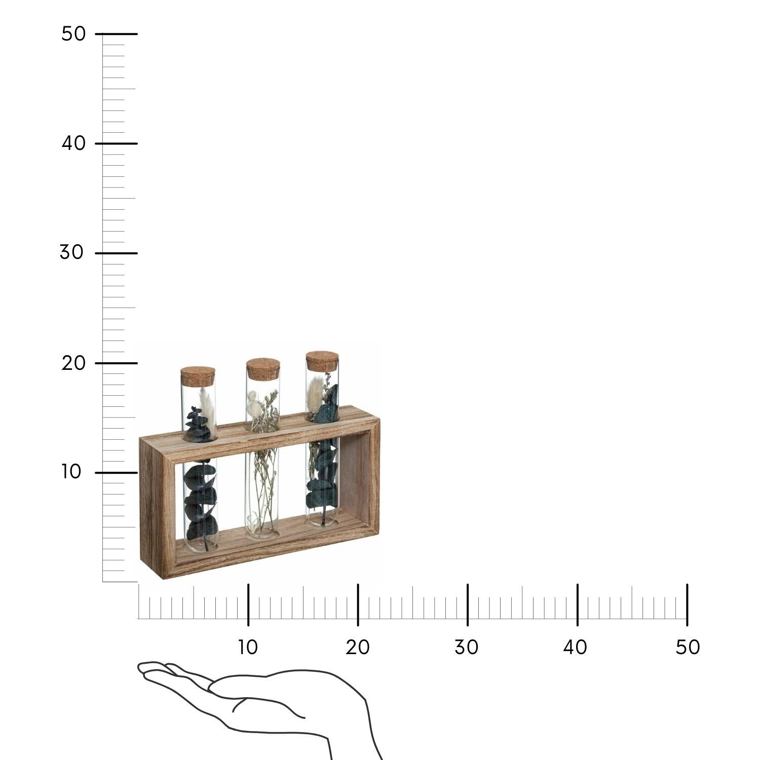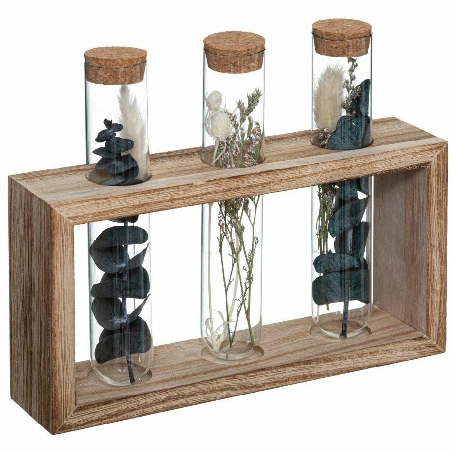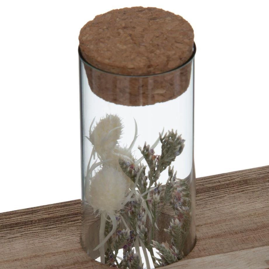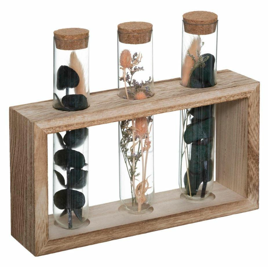 Výrazný design této trojité dekorativní vázy je založený na propojení tří skleněných trubic zasazených do světle hnědého dřevěného podstavce. Každá z váz je naplněná pečlivě vybranými sušenými květinami, díky čemuž celek působí mimořádně efektně a originálně. Taková kompozice je skvělou alternativou ke klasické váze na květiny – nepotřebuje vodu ani pravidelnou výměnu rostlin a přesto vždy vypadá svěže a stylově.