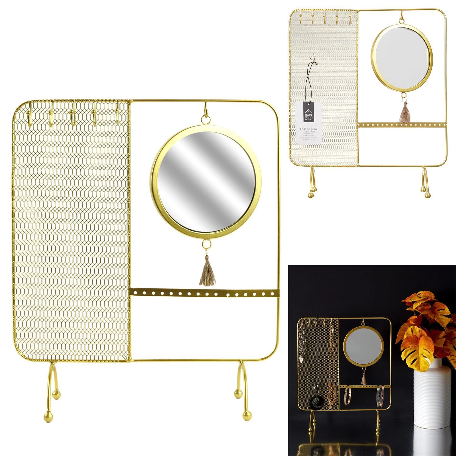 Tento kovový organizer na šperky umožňuje nejen přehledně uspořádat náhrdelníky, ale také zajistit jejich bezpečí a perfektní vzhled. Zlaté provedení podtrhuje luxusní charakter produktu a integrované zrcadlo umožňuje rychle vyzkoušet doplňky před odchodem z domu. Speciálně navržené držáky zaručují, že každý řetízek či přívěsek zůstane rozmotaný a snadno dostupný, což oceníte zejména při ranním shonu.