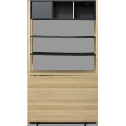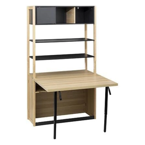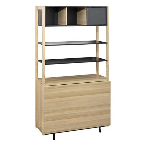 Knihovna Extensio od značky 5five simply smart je multifunkční kus nábytku spojující moderní loftový design s praktičností – nabízí uzavíratelné police a inovativní funkci výklopného stolu o šířce 100 cm a výšce 180 cm. Pečlivě zpracovaná kombinace kovu a desky v odstínu přírodního dřeva a matné černé barvy skvěle zapadá do požadavků současných interiérů. Ideální volba do obývacího pokoje, domácí kanceláře, ložnice nebo studentského pokoje, kde záleží na stylu i flexibilním využití prostoru.