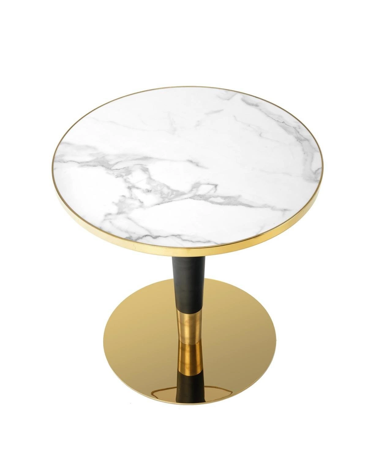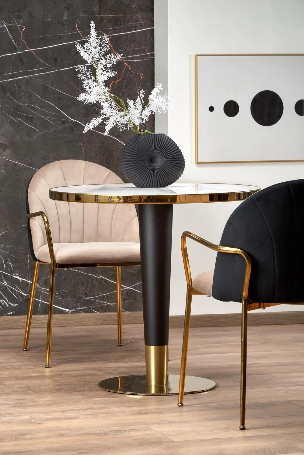 Mosa Intesi není jen jídelní stůl, ale také skutečná dekorace interiéru, která přináší atmosféru luxusu a elegance. Kulatá keramická deska v odstínu bílého mramoru vnáší do prostoru lehkost a harmonii, díky čemuž působí místnost světlejší a opticky větší. Zlatá a černá podstava na jedné noze působí vzdušně, umožňuje volné rozmístění židlí a zajišťuje maximální komfort při stolování i společenských setkáních. Tento moderní kulatý stůl se skvěle hodí do obývacího pokoje i jídelny zařízené v glamour stylu.