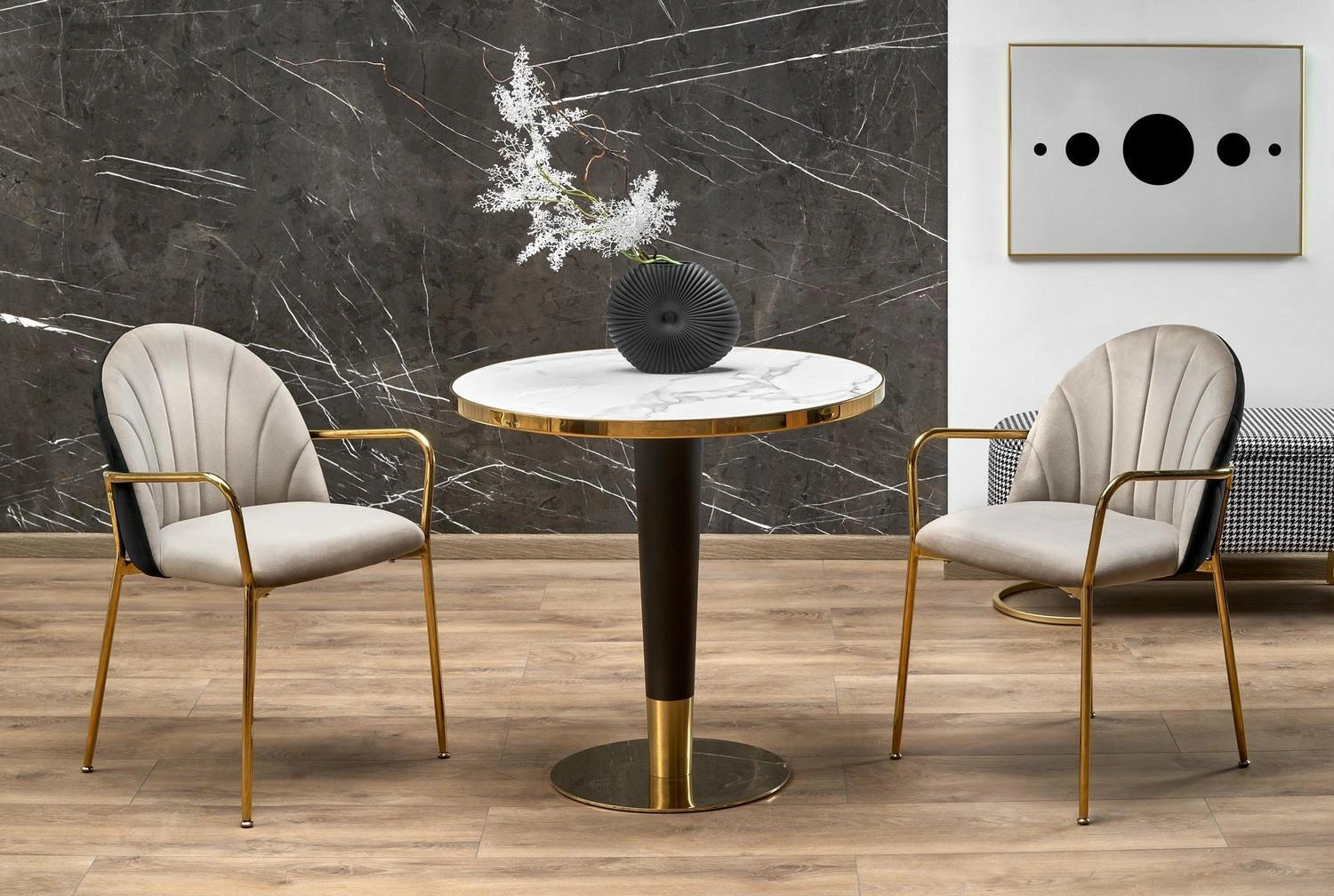 Kulatý stůl bílý mramor Mosa od značky Intesi je spojením moderní elegance a vytříbeného glamour stylu, navržený pro jídelnu i obývací pokoj. Kulatá deska o průměru 79 cm je vyrobena z keramiky imitující bílý mramor, která zaujme jemným vzorem a luxusním provedením. Stabilní podstavec na jedné noze v černozlatých tónech z kovu zajišťuje výbornou stabilitu a zároveň dodává nábytku jedinečný, designový charakter. Tento stůl se stane centrálním prvkem vašeho interiéru a nabídne pohodlné místo pro 2–3 osoby.