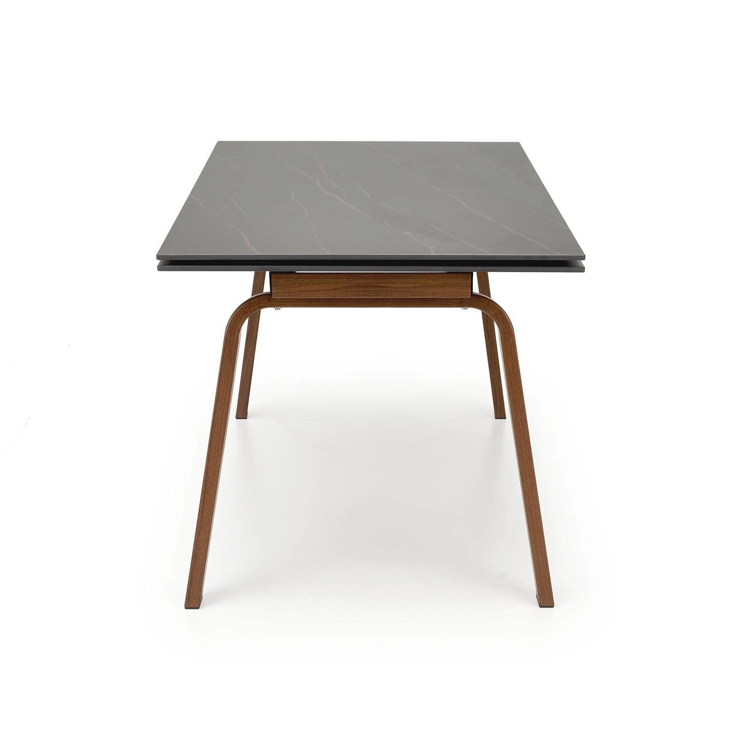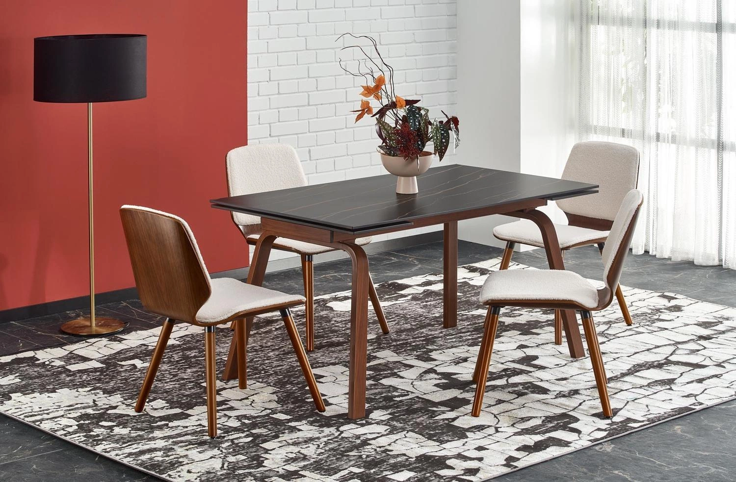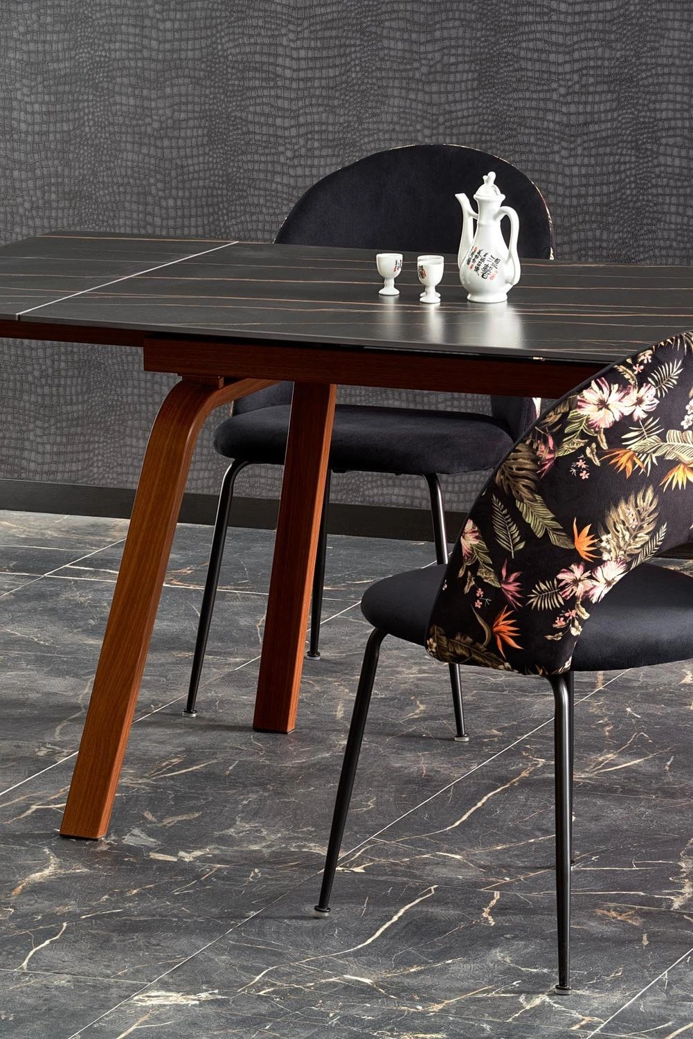 Stůl je vyroben z vysoce kvalitních materiálů, jako je slinutá a práškově lakovaná ocel, což zaručuje dlouhou životnost a odolnost proti poškození. Černá mramorová deska a nohy v barvě ořechu vytvářejí jedinečný design, který jistě potěší každého milovníka moderního stylu. Výška stolu je 76 cm, což umožňuje pohodlné sezení u stolu. Kovový rám zajišťuje stabilitu a bezpečnost používání.