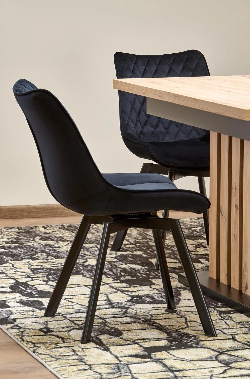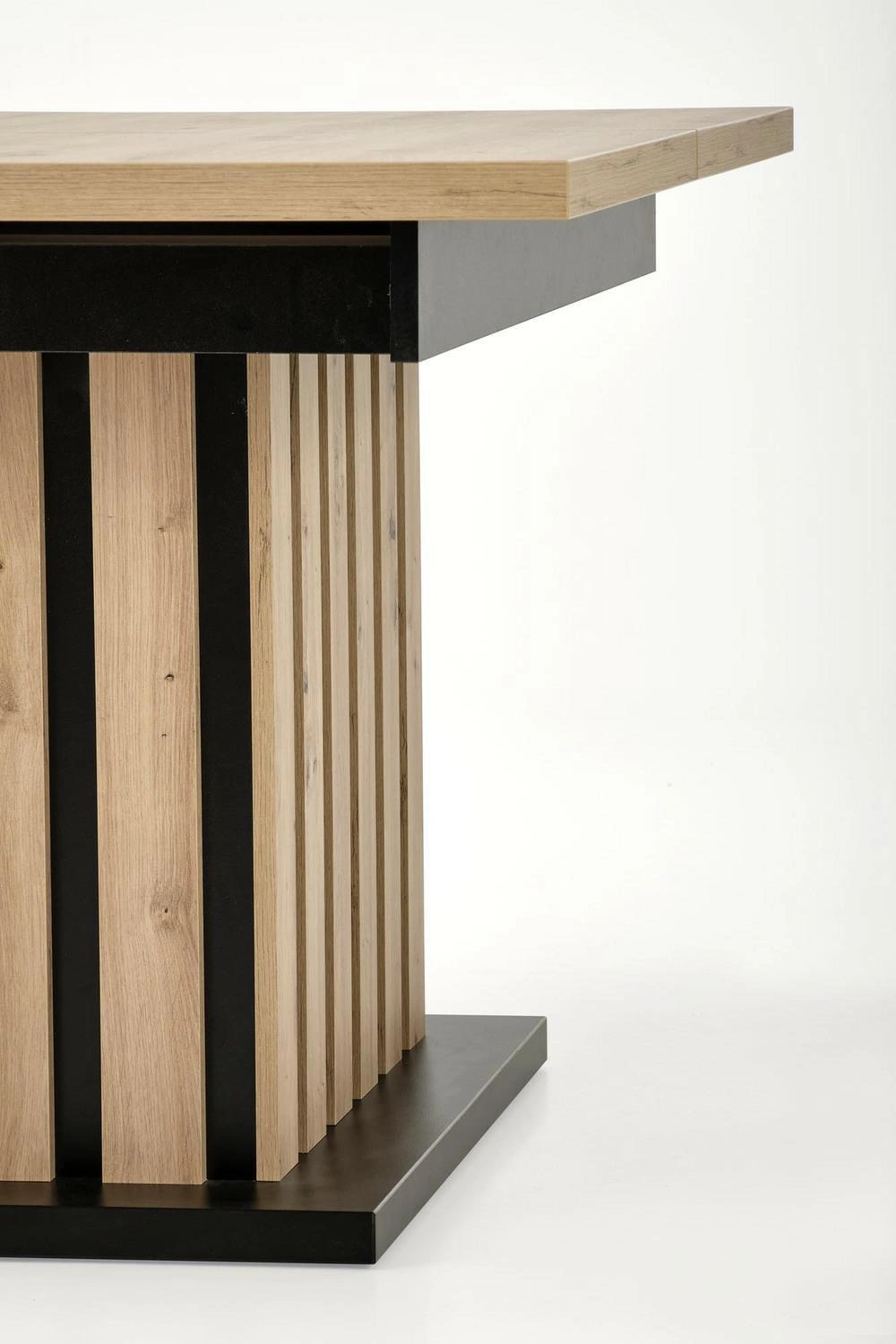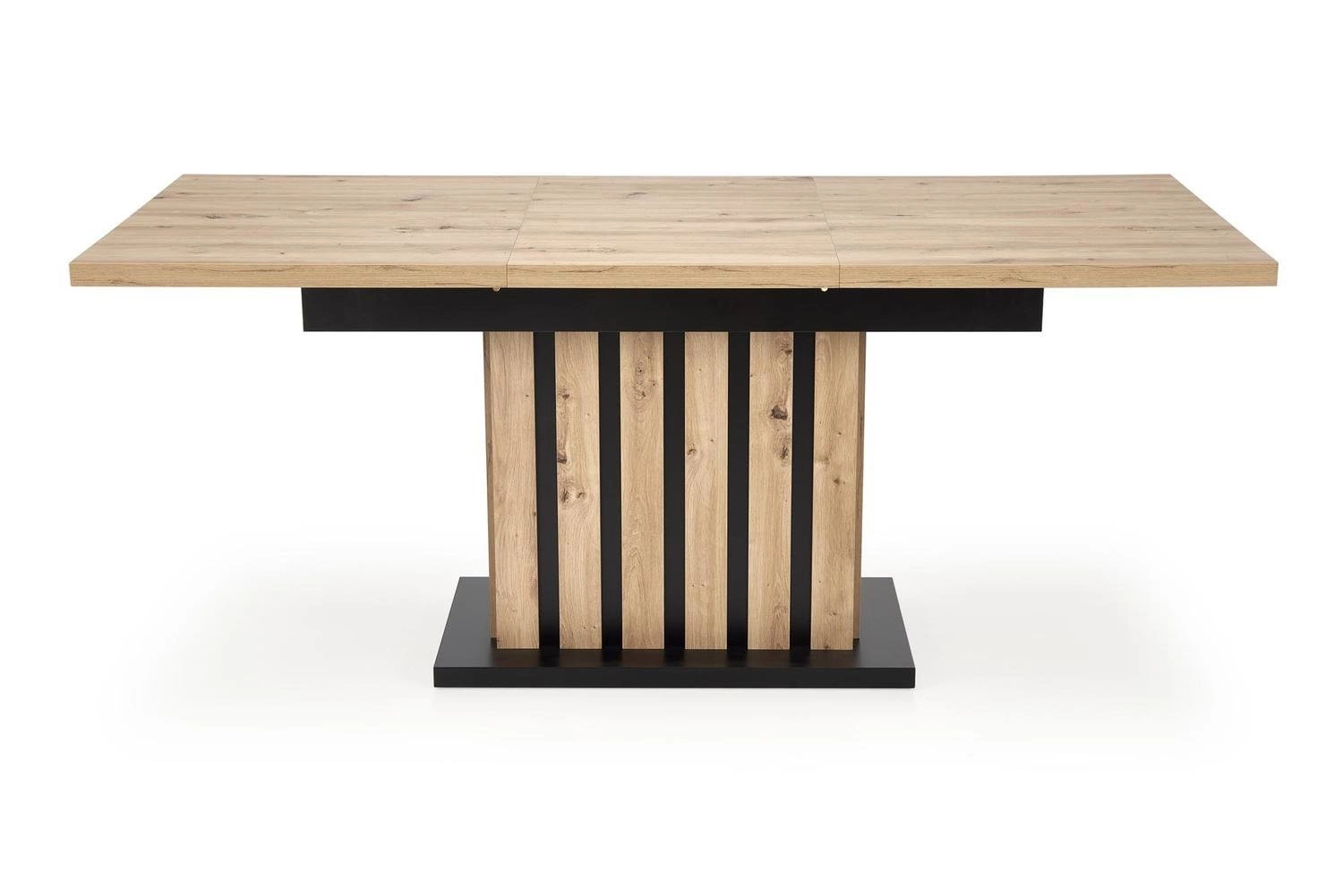 Lamis je jídelní stůl, který perfektně doplní současné trendy v interiérovém designu. Výrazný, ale přitom minimalistický tvar obdélníkové desky v dekoru dub artisan dělá ze stolu středobod každého prostoru. Jedna masivní noha v přírodní barvě dubu s černým detailem nejen upoutá pozornost, ale také umožní snadné umístění židlí a poskytne maximální volnost pohybu během rodinných večeří nebo posezení s přáteli.