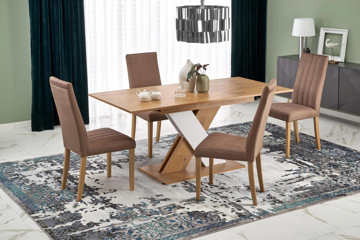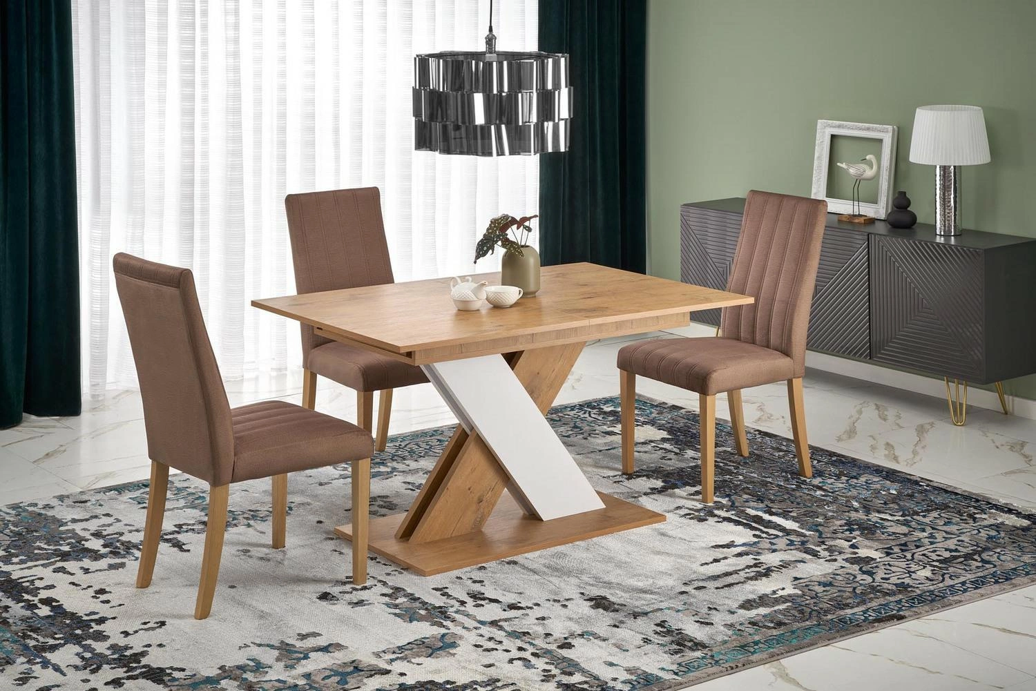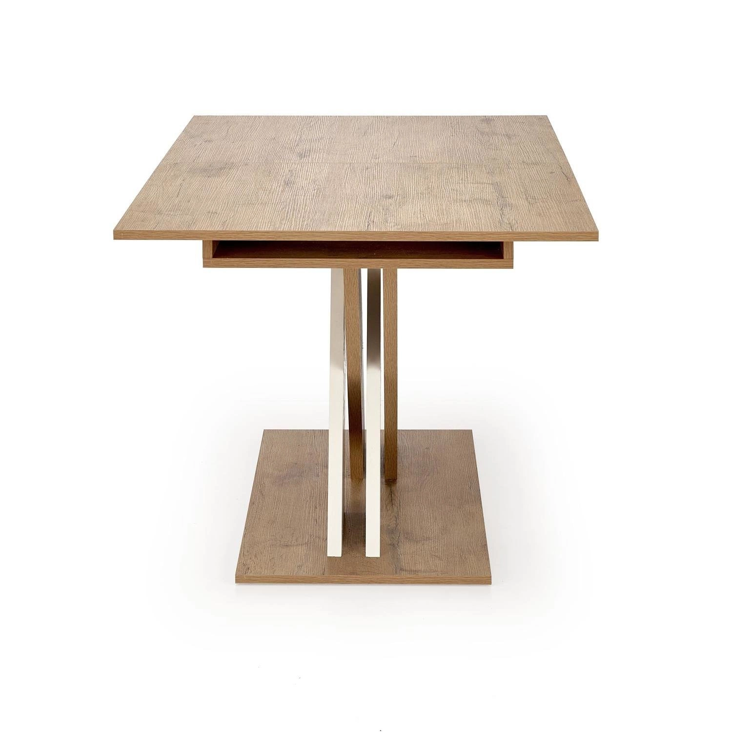 Rozkládací jídelní stůl Terol od značky Intesi je ideální volbou pro ty, kdo hledají moderní styl a praktická řešení. Obdélníková deska v odstínu přírodního dubu Lancelot působivě kontrastuje s bílou, stabilní základnou na jedné noze, což vytváří harmonický celek dokonale ladící s interiérem jídelny, obývacího pokoje nebo kuchyně. Díky rozkládací funkci snadno prodloužíte stůl z délky 130 na 175 cm, takže skvěle poslouží jak při každodenním používání, tak i během rodinných oslav nebo setkání s přáteli.