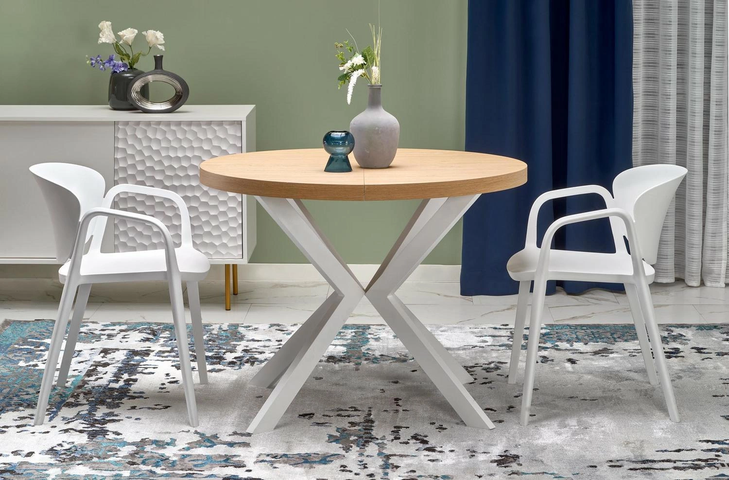 Kulatý rozkládací stůl Roni od značky Intesi je moderní jídelní stůl, který spojuje vysokou funkčnost s výjimečným designem. Kulatá deska o průměru 100 cm v přírodním dubovém dekoru lze rozložit až do délky 250 cm, což poskytuje dostatek místa i pro větší skupinu hostů. Stabilní bílá podnož z oceli dokonale podtrhuje moderní charakter nábytku a výška 75 cm zajišťuje pohodlí při každodenním používání.