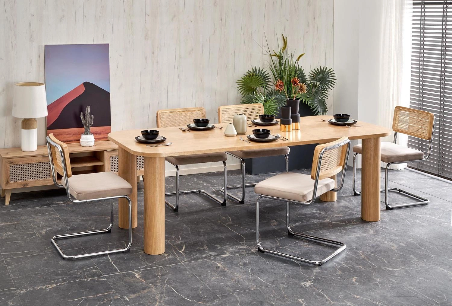 Rozkládací stůl Zilonis od značky Intesi je elegantním a moderním řešením do jídelny, obývacího pokoje nebo kuchyně. Obdélníková deska v odstínu přírodního dubu o šířce 160 cm, kterou lze rozložit až na 240 cm, je ideální jak pro každodenní stolování, tak i pro větší rodinné oslavy. Pevná konstrukce na čtyřech nohách a praktický rozkládací mechanismus zajišťují pohodlné používání a mimořádnou odolnost.