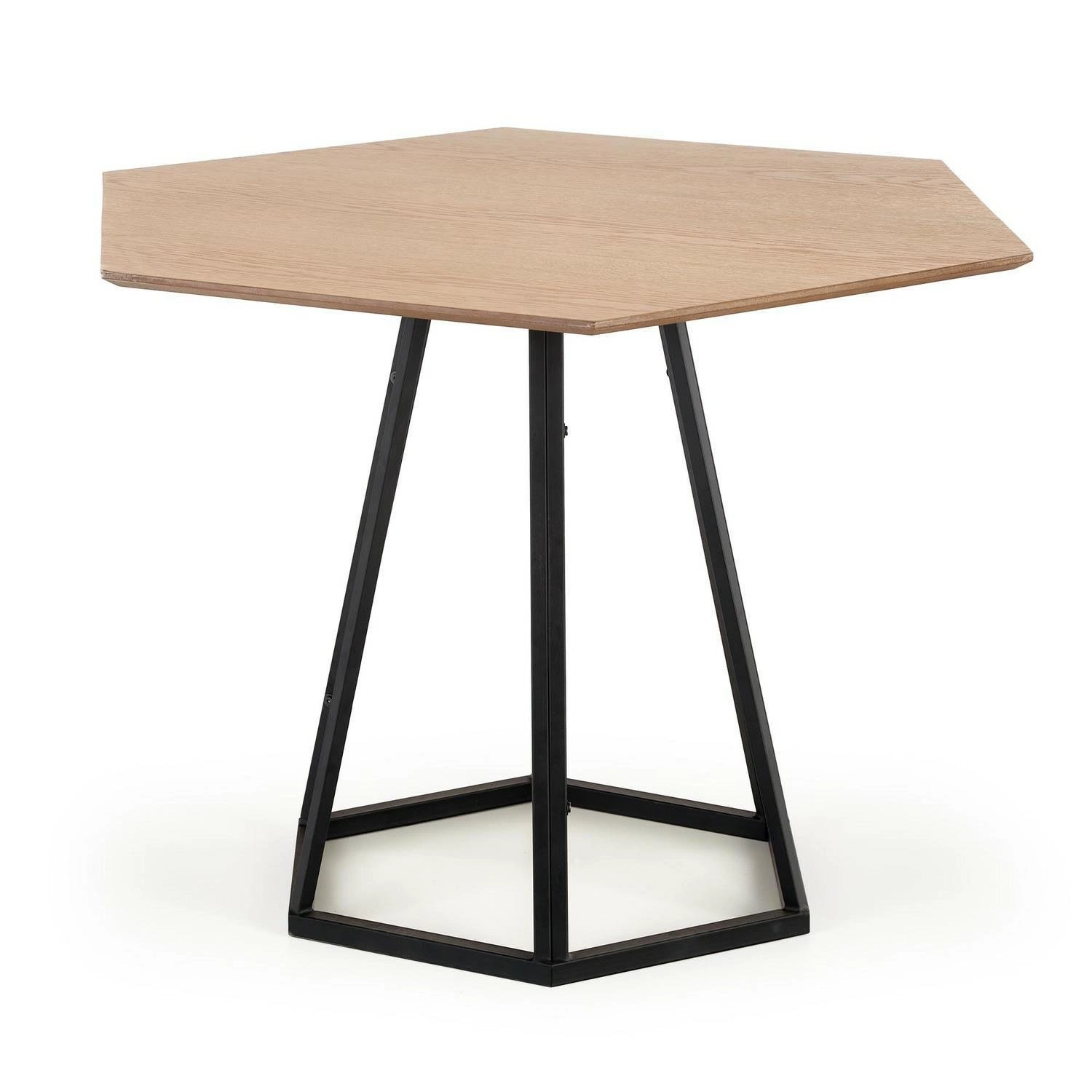 Stůl Hexis je kus nábytku s výjimečným designem a funkčností. Jeho šestihranná stolová deska o průměru 110 cm z MDF s dýhou v přírodní barvě mu dodává přirozený půvab a eleganci. Noha stolu z práškově lakované oceli je černá, což vytváří kontrastní barevnou kombinaci.