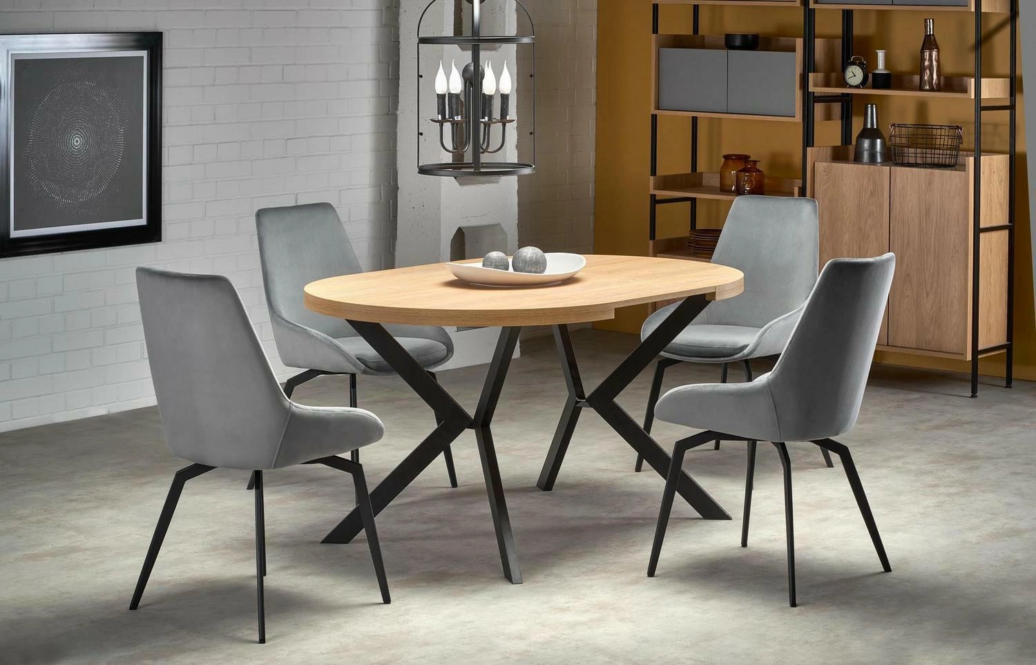 Kulatý rozkládací stůl Roni od značky Intesi je spojením moderního stylu a funkčnosti, která splní požadavky i těch nejnáročnějších uživatelů. Deska ve vzhledu přírodního dubu o průměru 100 cm se rozkládá až do impozantních 250 cm, což umožňuje pohodlně usadit i větší skupinu hostů. Masivní ocelová podnož v černé barvě zajišťuje stabilitu a dlouhou životnost, díky čemuž je tento stůl ideální volbou do jídelny, obývacího pokoje nebo stylové restaurace.