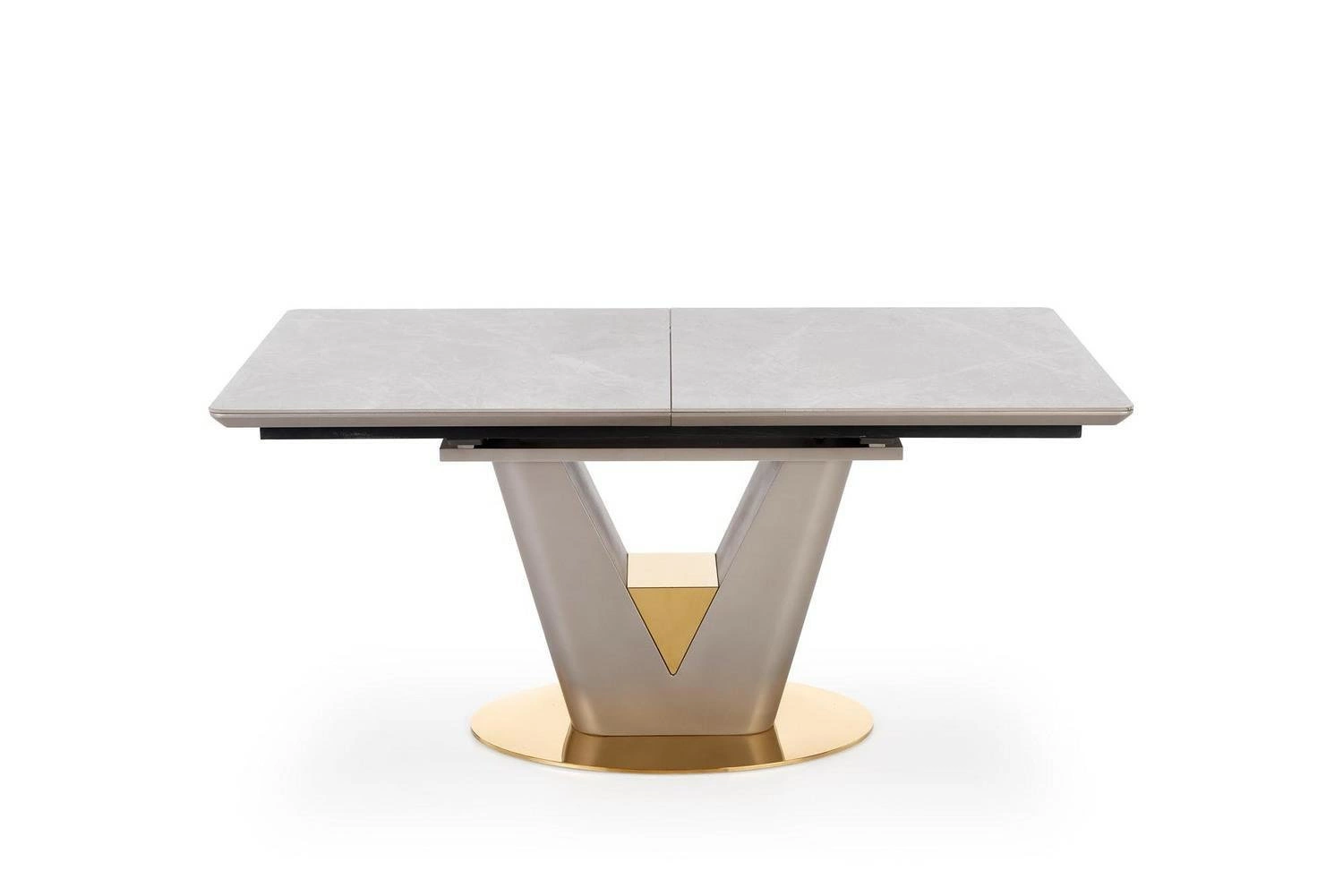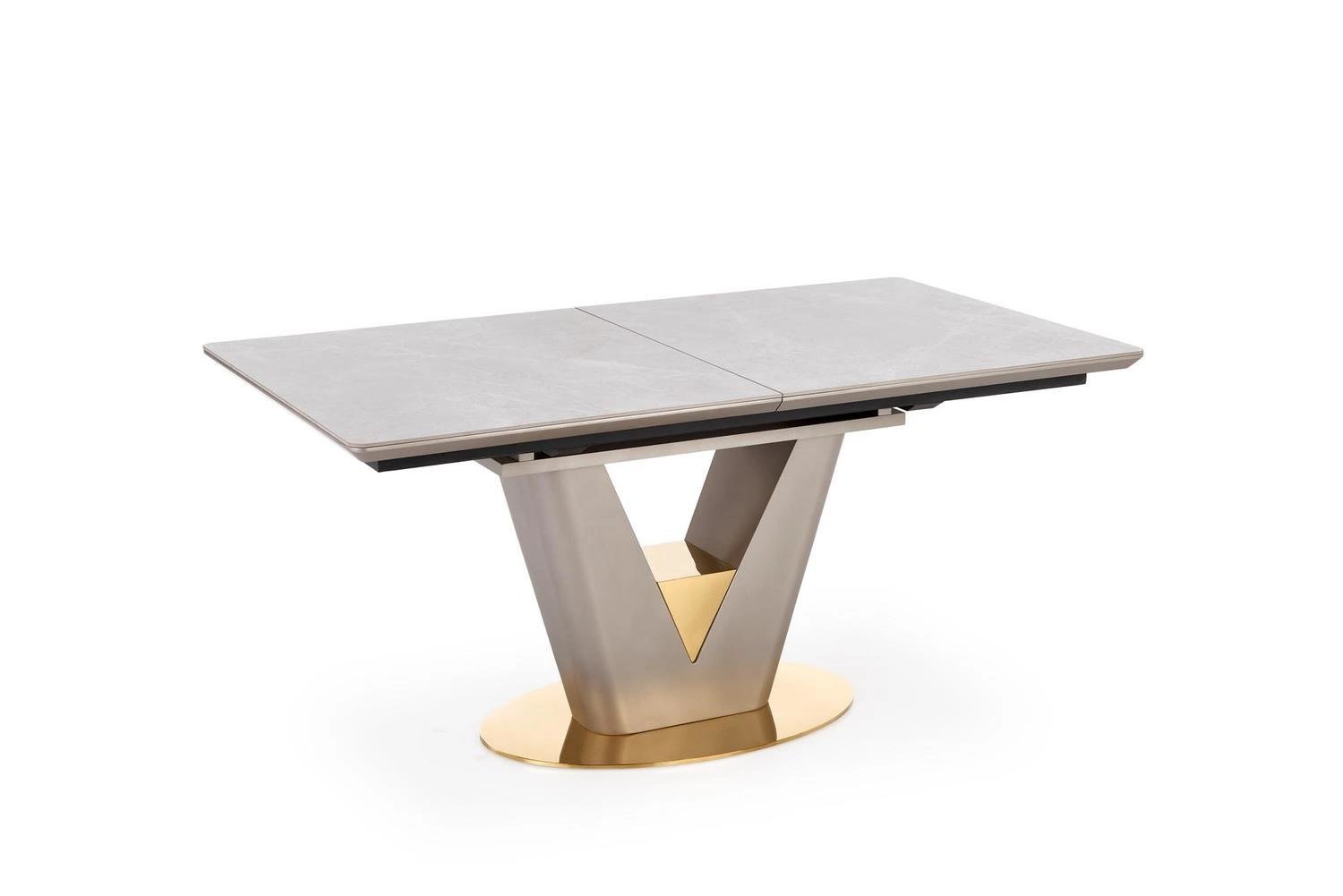 Rozkládací jídelní stůl Vermut od značky Intesi je ideální volbou pro milovníky moderní elegance a maximální funkčnosti. Obdélníková deska z keramiky v odstínu bílého mramoru o rozměrech 160–220×90 cm zaujme luxusním vzhledem a odolností vůči každodennímu používání. Stabilní centrální noha ve zlatém provedení podtrhuje designový charakter stolu a současně zajišťuje pohodlí a komfort během společných jídel.