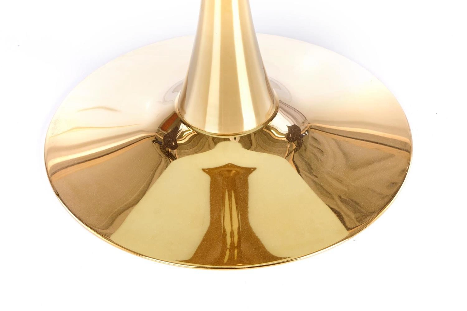 - Zlatá ocelová podnož na jedné noze – stabilita a luxusní akcent v moderním interiéru