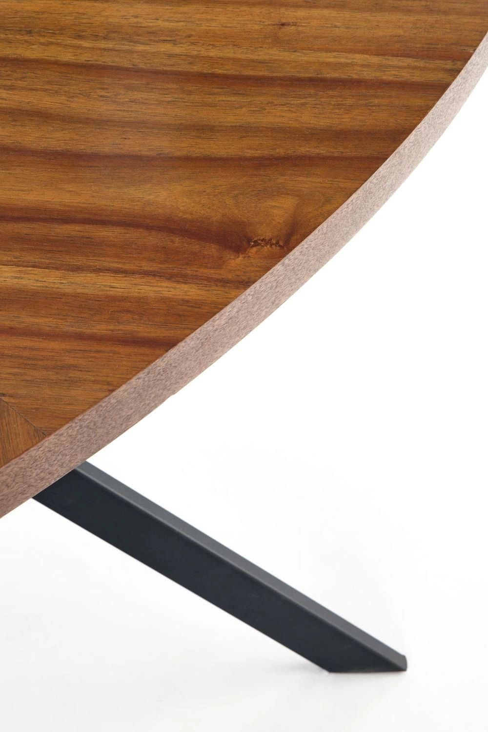 Kulatý stůl Locco představuje harmonické spojení teplého ořechového odstínu a surové elegance černých kovových nohou. Minimalistický tvar a pevná konstrukce upoutají pozornost a vnesou do vašeho domova jedinečný industriální charakter. Tento jídelní stůl je ideální pro moderní a loftové interiéry, kde se stane centrem rodinných setkání i společenských večírků.