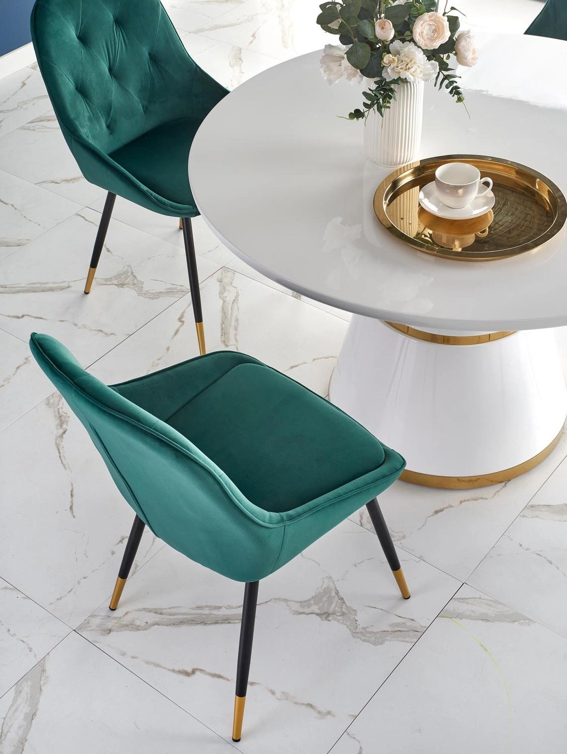 Kulatý stůl Marlen kombinuje nadčasovou bílou s luxusním zlatým detailem, čímž podtrhuje svůj jedinečný charakter. Základna na jedné noze dodává stolu moderní vzhled a zároveň umožňuje snadný přístup ze všech stran. Díky tomu jsou každodenní jídla, slavnostní večeře i setkání s přáteli ještě pohodlnější. Deska z odolného materiálu se snadno udržuje v čistotě, což oceníte při každodenním používání.