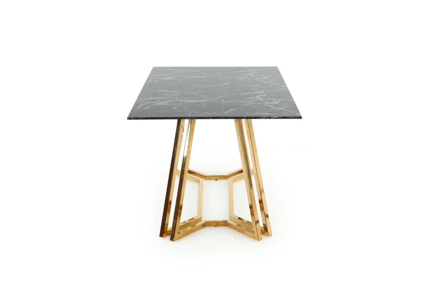 Stůl Gloria vyniká pevnou, samostatnou nohou z nerezové oceli ve zlatém odstínu. Toto řešení zajišťuje nejen vysokou stabilitu i při intenzivním používání, ale také poskytuje více prostoru kolem stolu – každý host má dostatek místa a volnost při sezení. Zlatý detail perfektně ladí s černou deskou, zdůrazňuje moderní glamour styl a dodává interiéru originální charakter.