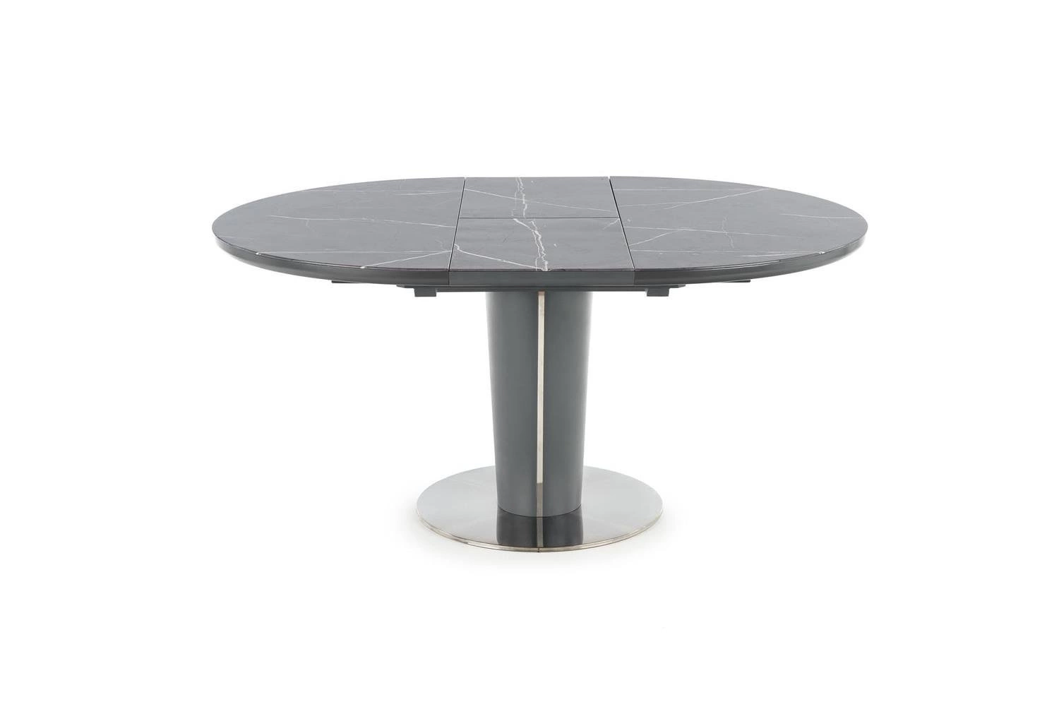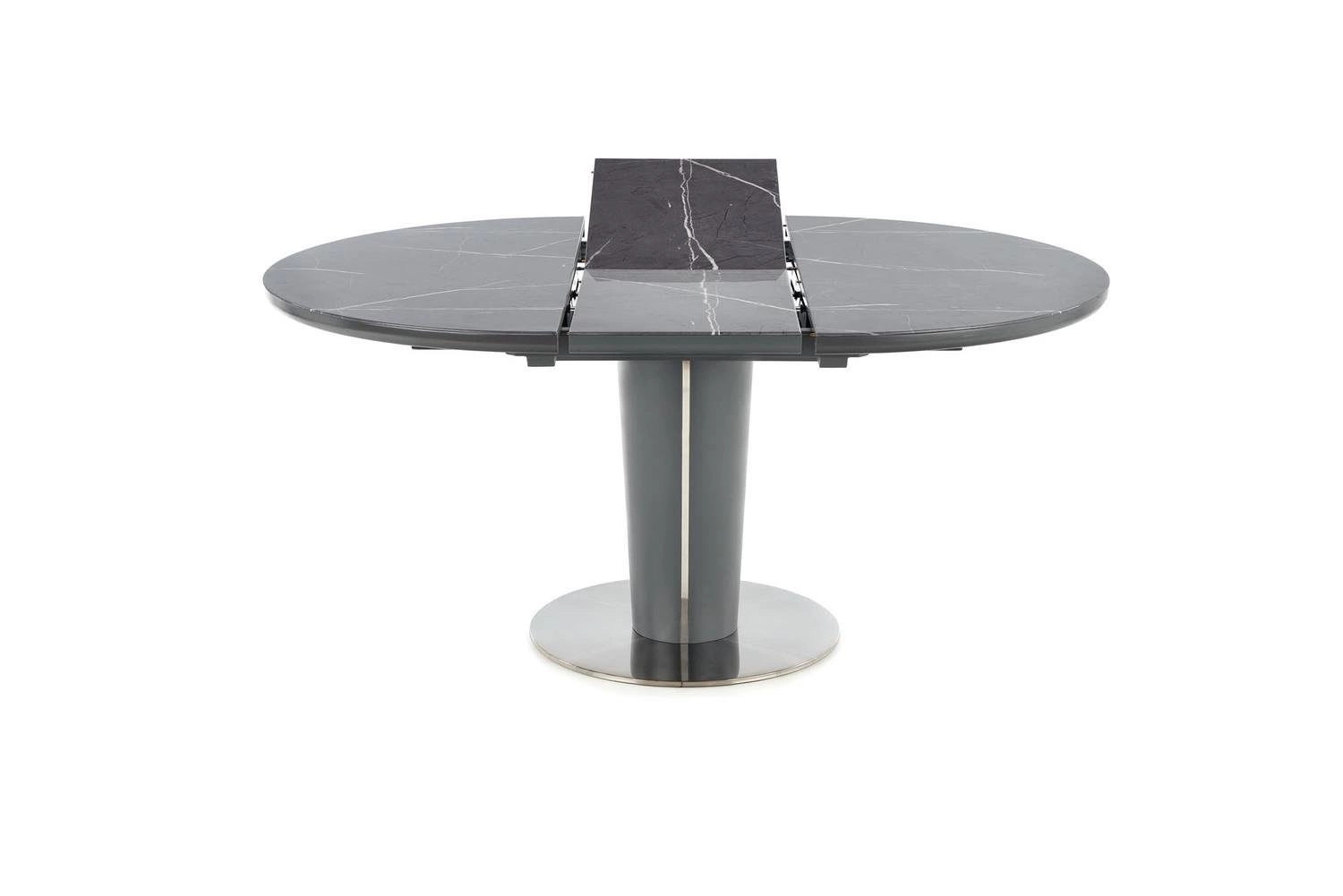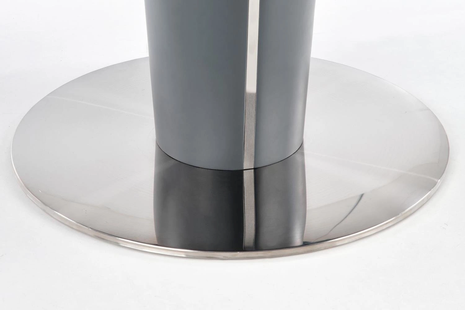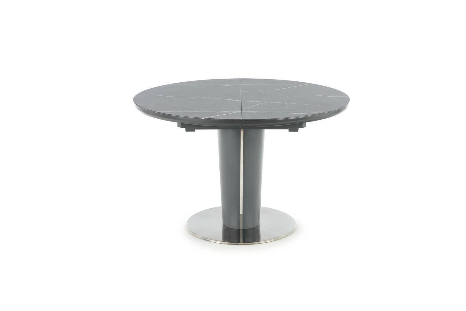 Rozkládací kulatý stůl Cardo Intesi je moderním kusem nábytku do jídelny, který spojuje designový vzhled s každodenní funkčností. Kulatá deska o průměru 120 cm, vyrobená z odolné desky a šedého skla, lze snadno rozšířit až na 160 cm. Stabilitu zajišťuje jediná masivní ocelová noha, která podtrhuje minimalistický styl a usnadňuje rozmístění židlí kolem stolu.