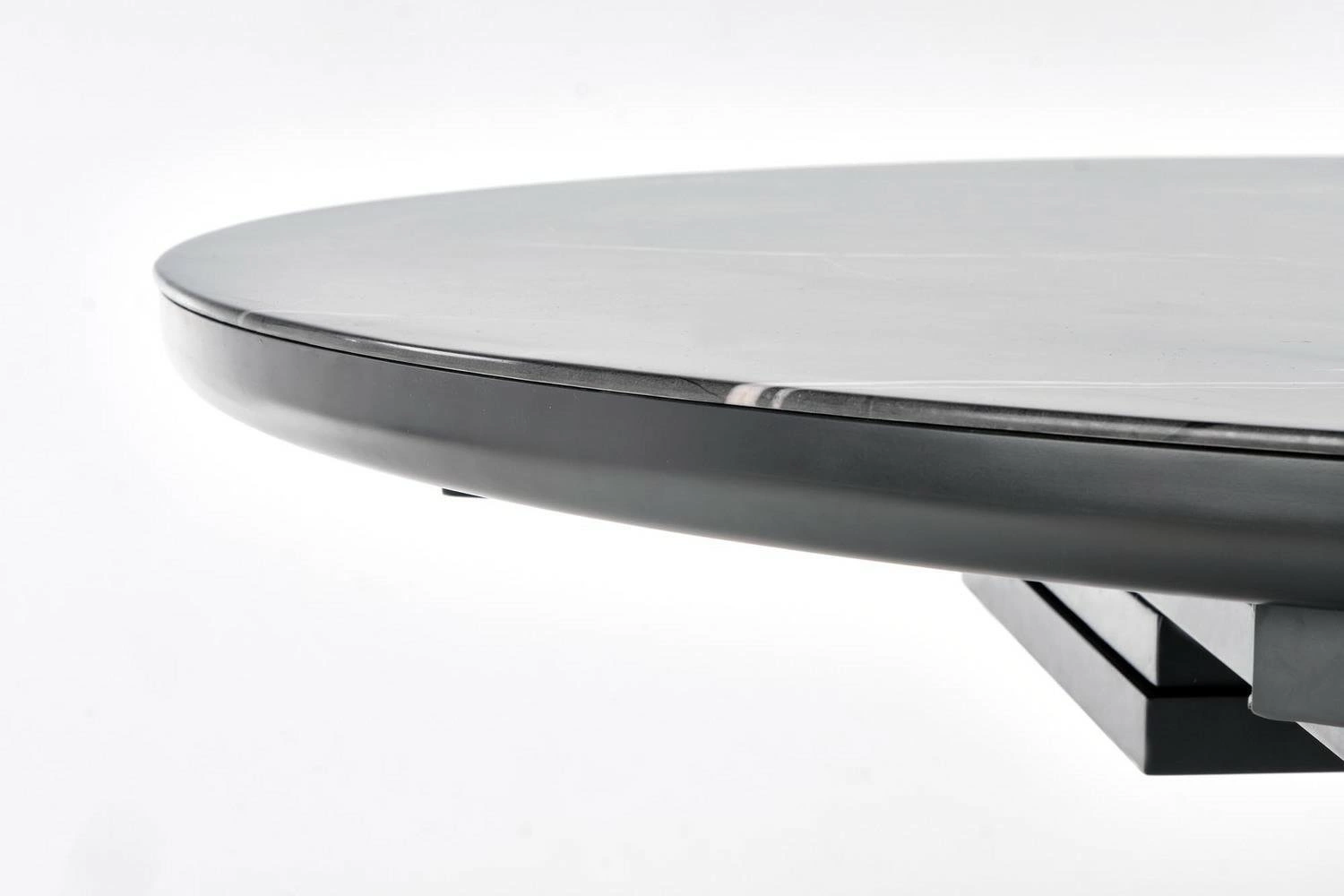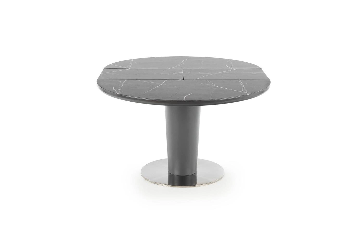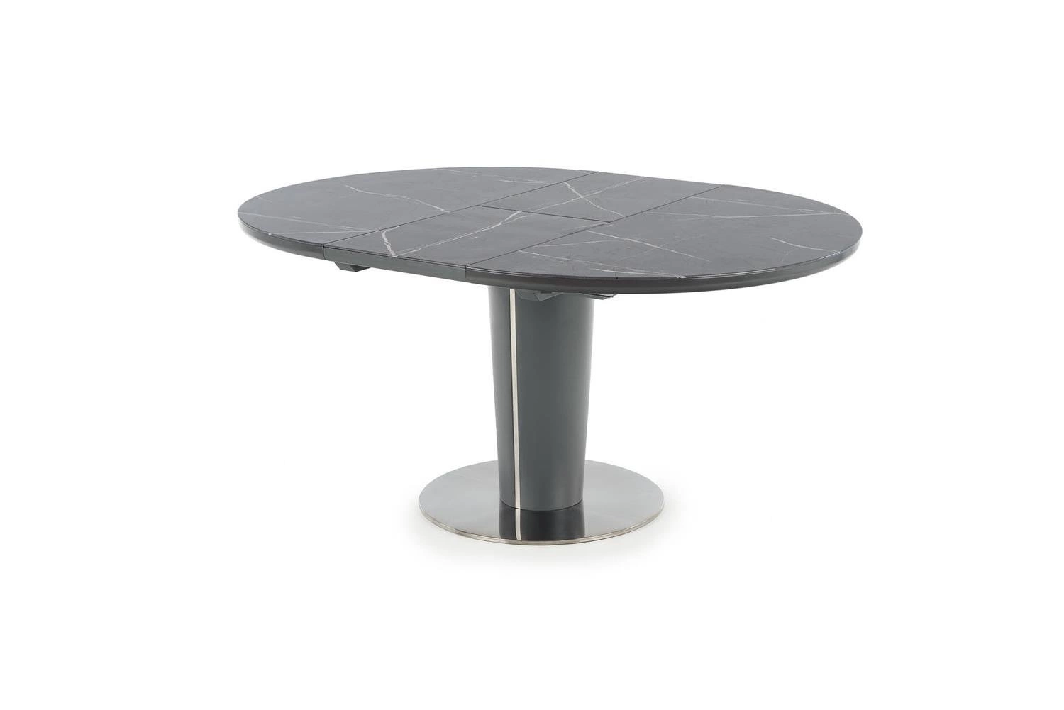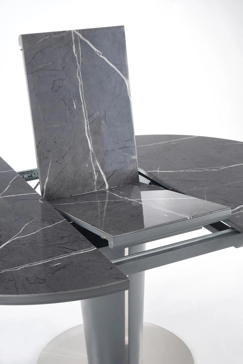 Rozkládací kulatý stůl Cardo Intesi je moderním kusem nábytku do jídelny, který spojuje designový vzhled s každodenní funkčností. Kulatá deska o průměru 120 cm, vyrobená z odolné desky a šedého skla, lze snadno rozšířit až na 160 cm. Stabilitu zajišťuje jediná masivní ocelová noha, která podtrhuje minimalistický styl a usnadňuje rozmístění židlí kolem stolu.