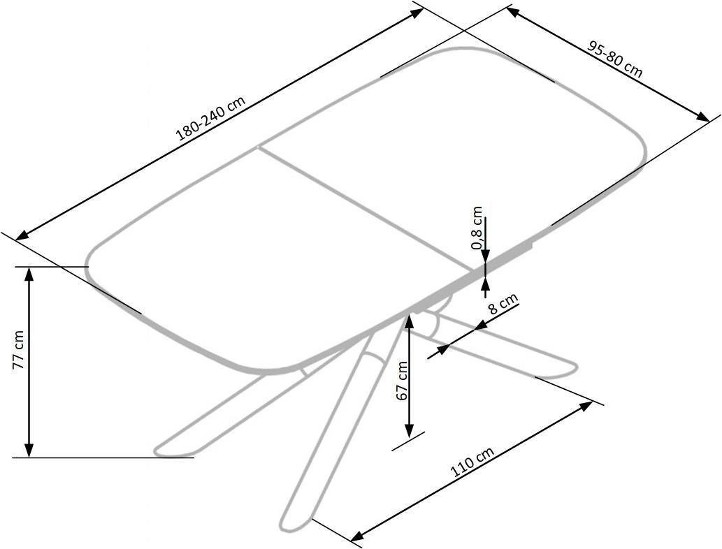 Stůl má rozměry 180-240/95/77 cm, což umožňuje pohodlné usazení až 10 osob. Jeho obdélníkový tvar a sklopná deska usnadňují servírování jídla a nápojů a zároveň poskytují dostatek prostoru pro odpočinek a rozhovory. Vysoká kvalita materiálů, jako je sklo a práškově lakovaná ocel,zaručuje odolnost a pevnost nábytku po dlouhá léta.tento stůl je nejen praktickým řešením, ale také dekorativním prvkem .