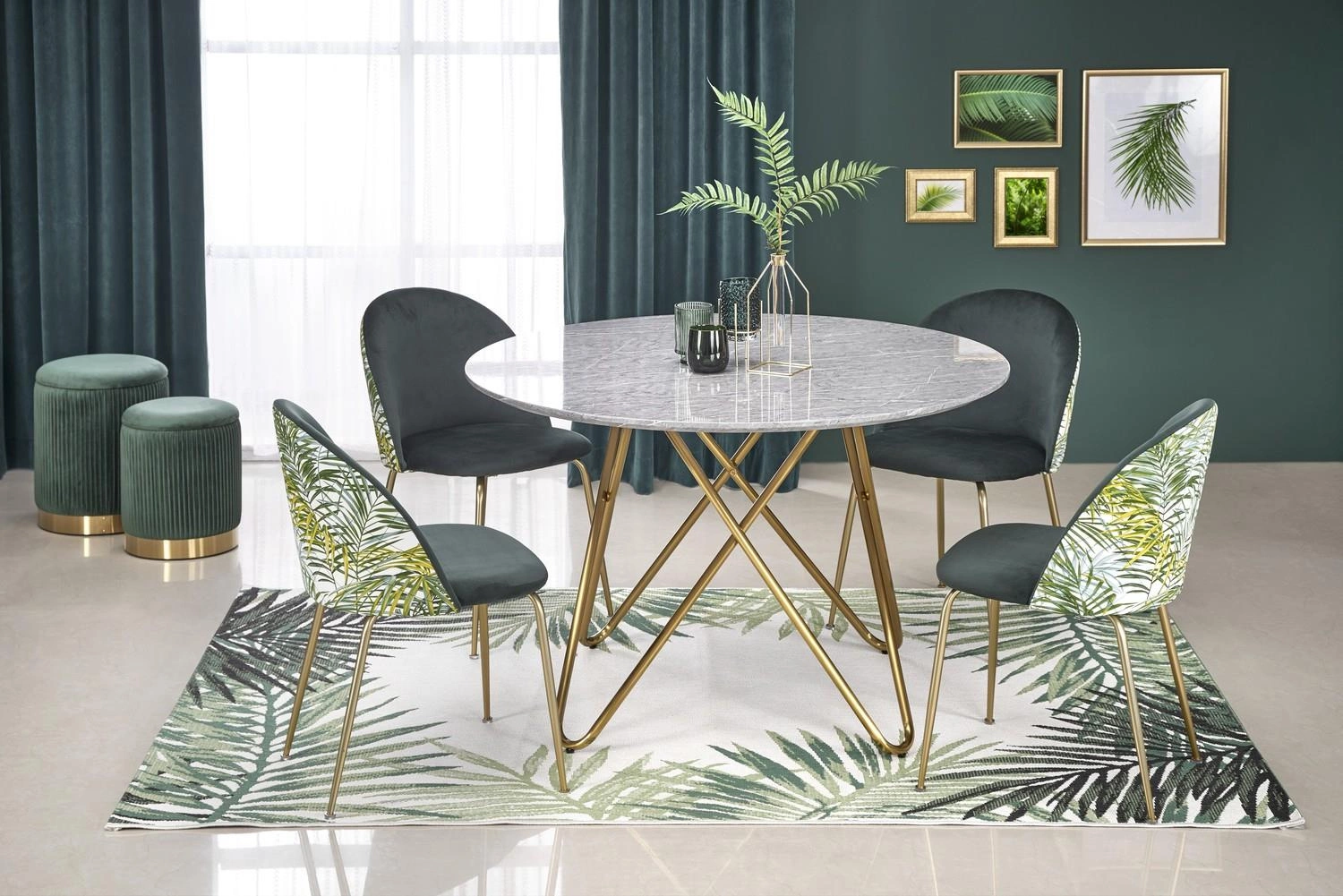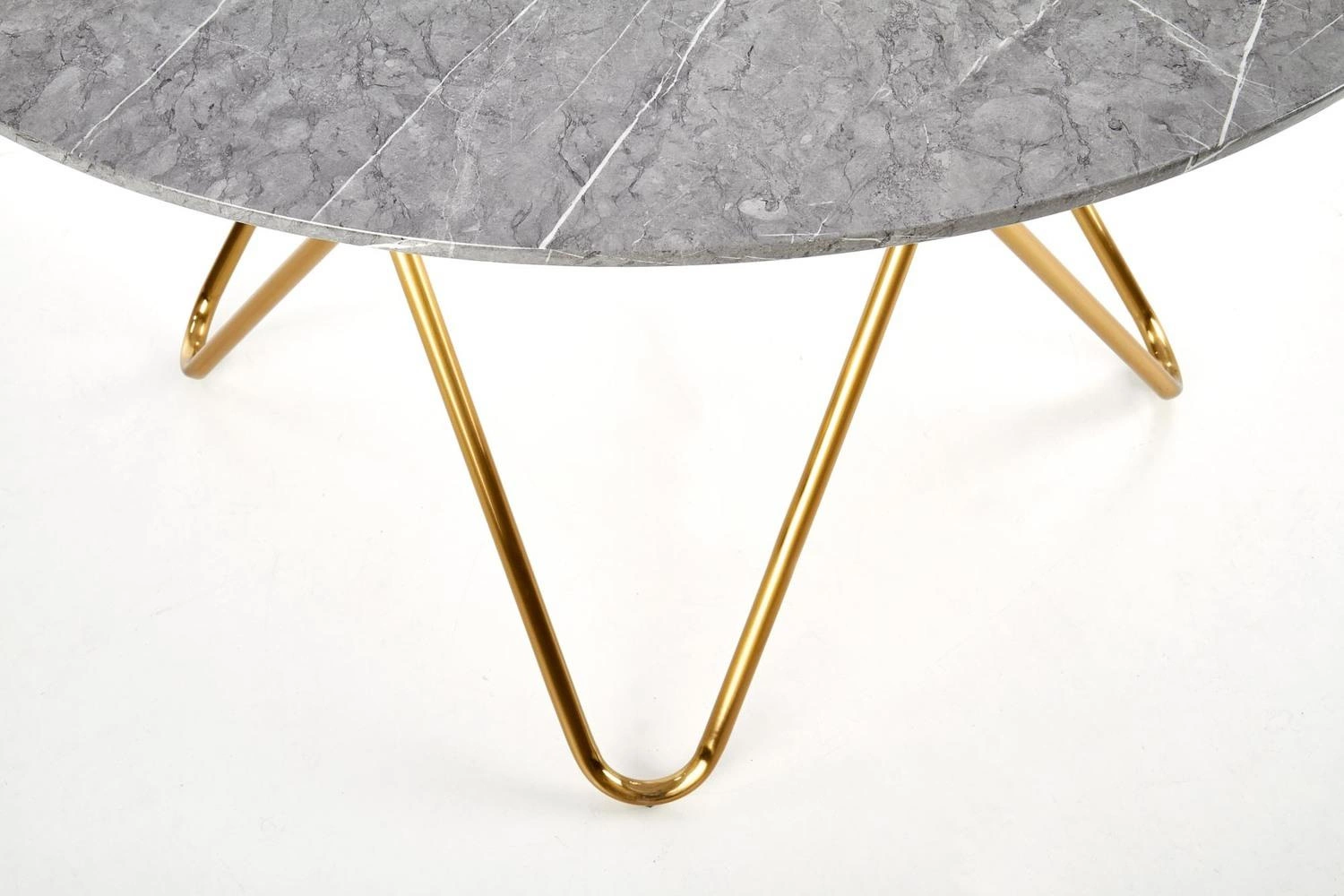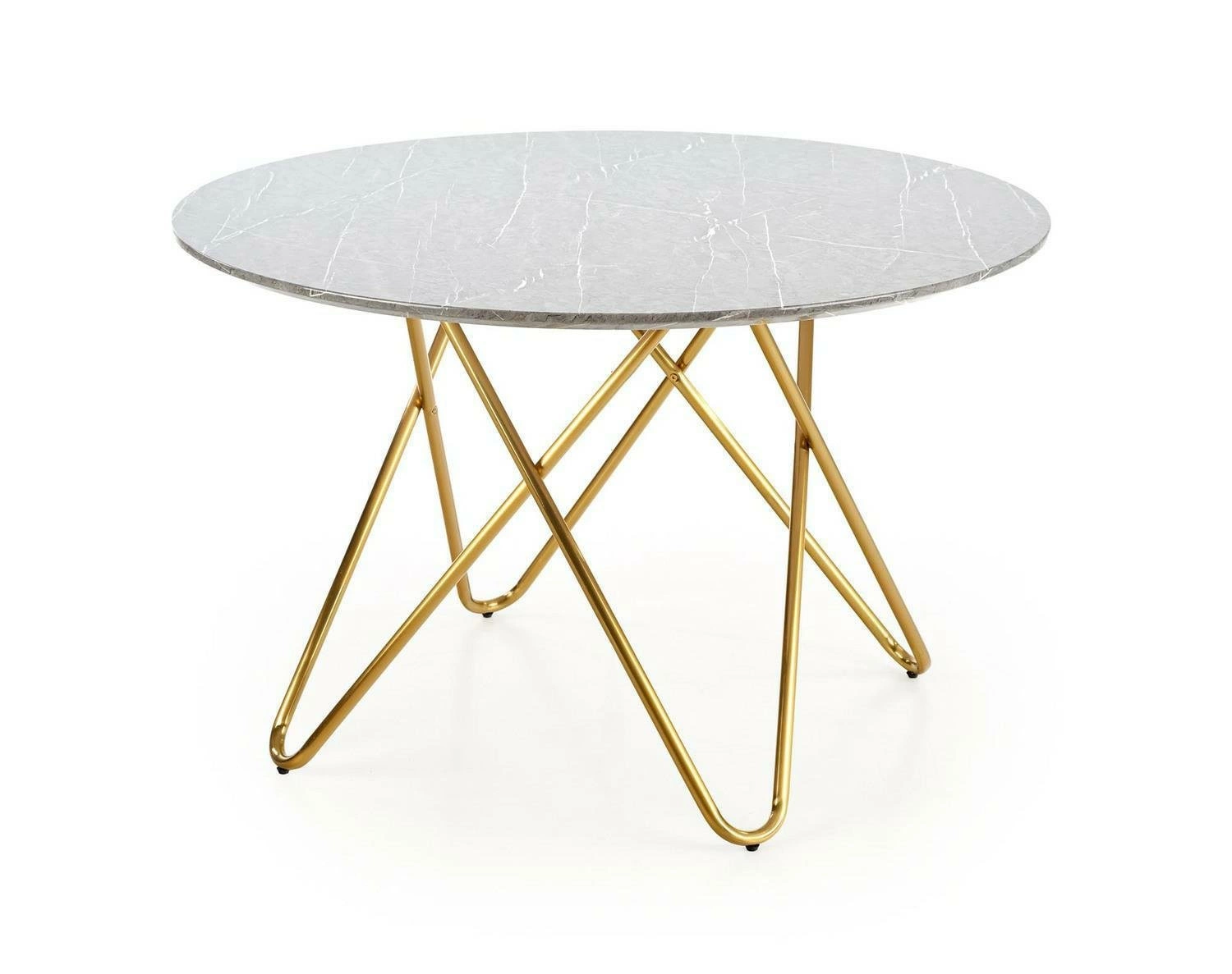 Kulatý jídelní stůl Cristallo od značky Intesi je výrazným prvkem, který dodá vašemu interiéru moderní eleganci a špetku glamour stylu. Kulatá deska o průměru 120 cm s šedým povrchem inspirovaným mramorem vytváří působivý vzhled, ideální jak pro každodenní stolování, tak slavnostní příležitosti. Stabilní kovové nohy ve zlaté barvě podtrhují luxusní charakter stolu a zajišťují jeho pevnost a odolnost. Není rozkládací, je určený do jídelny a spojuje funkčnost s vytříbeným designem, který upoutá pozornost a pozvedne každý interiér.