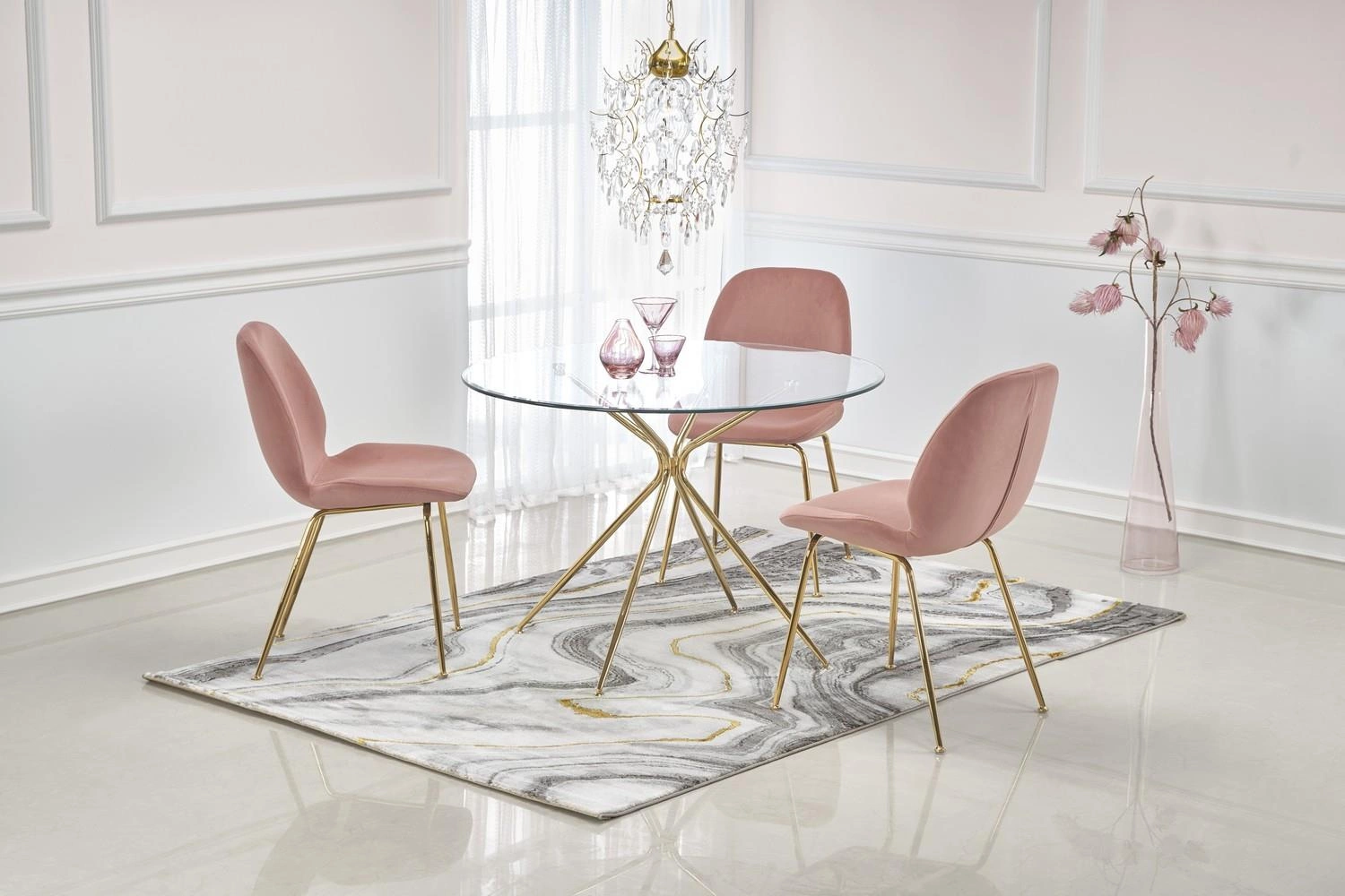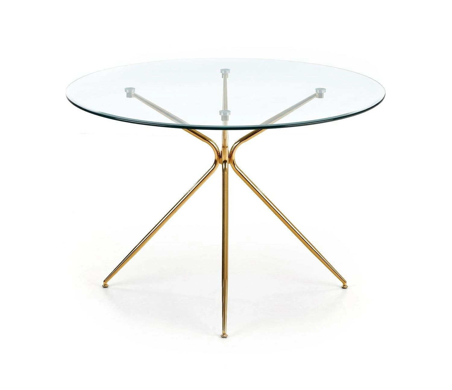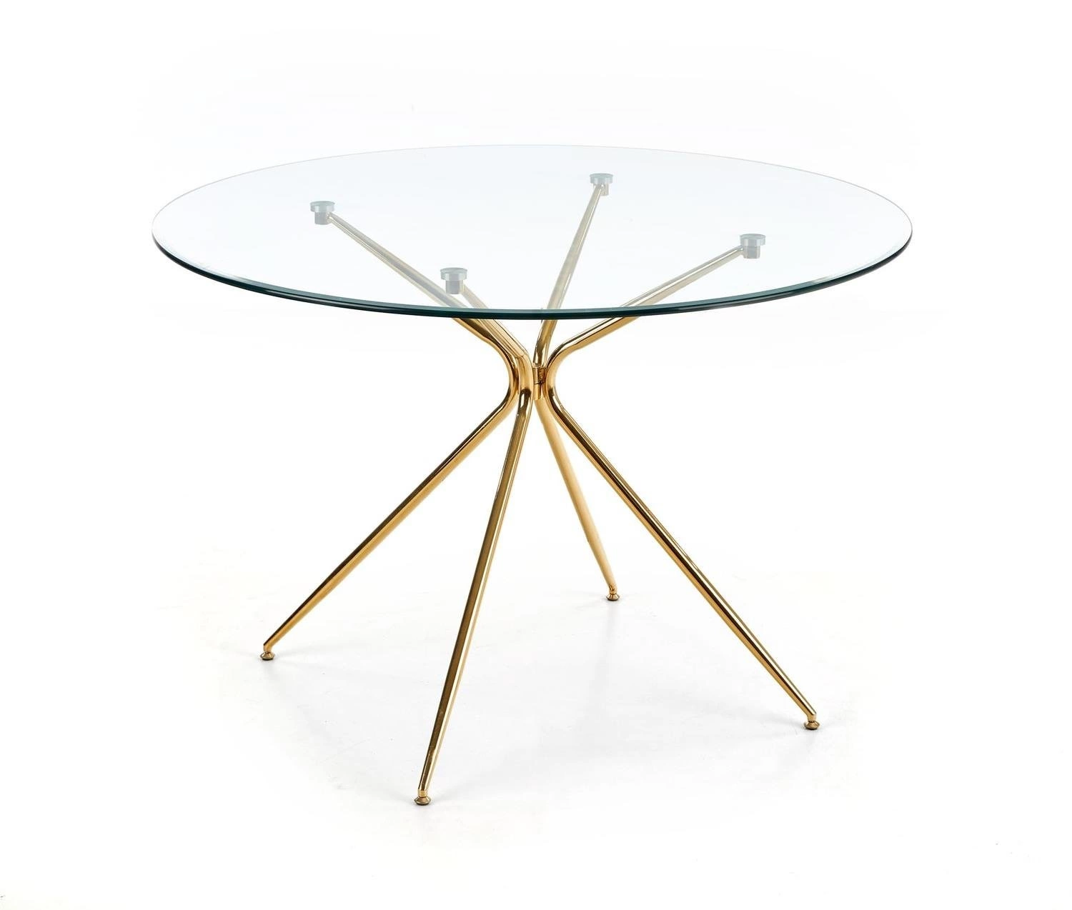 Kulatý jídelní stůl Dore od značky Intesi spojuje transparentní skleněnou desku o průměru 110 cm s efektní zlatou kovovou podnoží. Tento model zaujme nejen svým moderním glamour stylem, ale také pevností provedení a pohodlím při každodenním používání. Díky výšce 74 cm je stůl ideální jako ústřední bod jídelny i jako elegantní stůl do obývacího pokoje, který na sebe upoutá pozornost jemným leskem a vzdušnou formou.