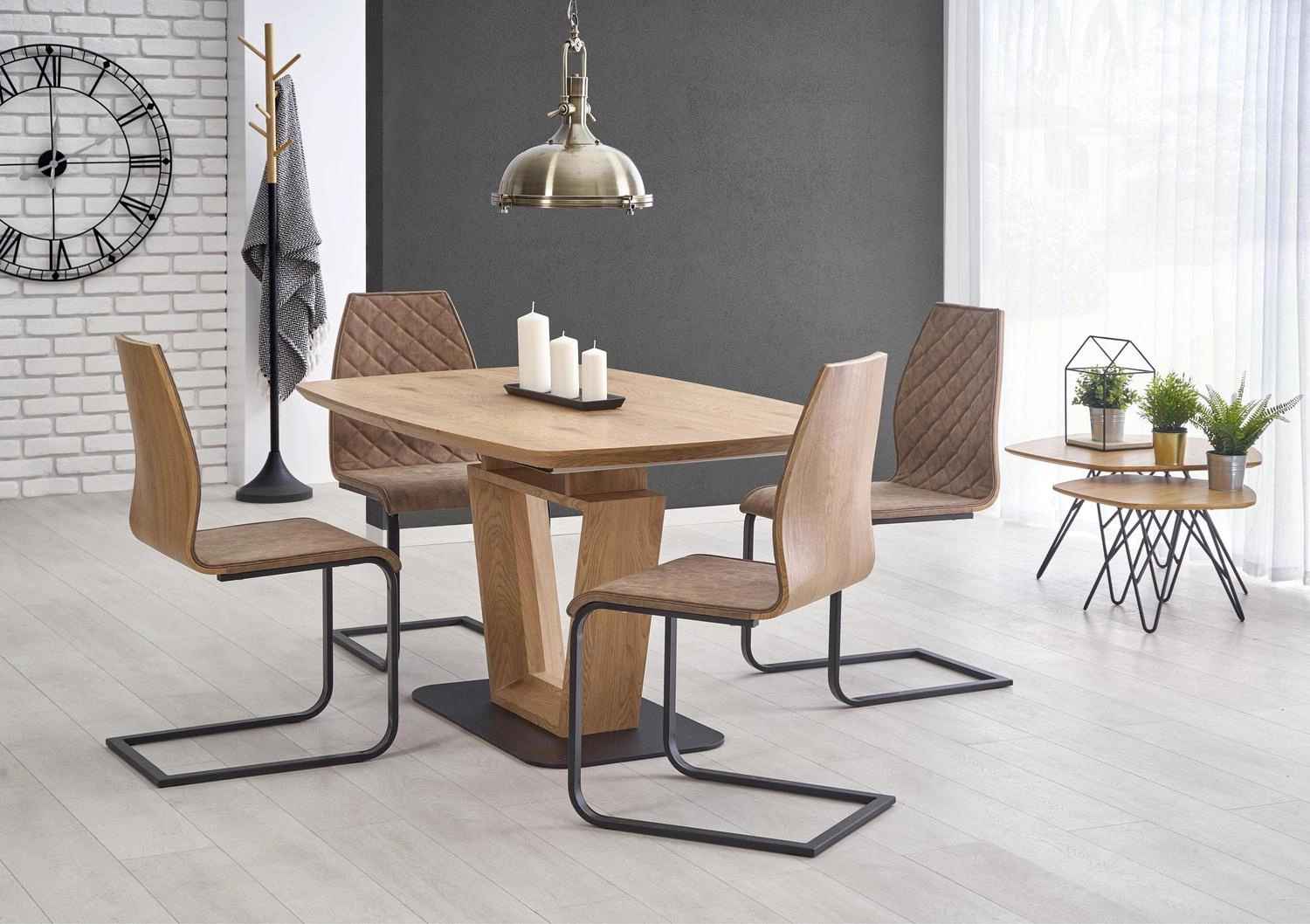 Caby je moderní stůl, který skvěle zapadne do interiérů inspirovaných industriálním stylem. Deska v odstínu zlatého dubu přináší do prostoru teplo a nadčasovou eleganci, zatímco černé kovové nohy podtrhují robustnost a odolnost celé konstrukce. Tato kombinace činí stůl ideálním do jídelny, otevřené kuchyně nebo loftového obývacího pokoje, kde se stává centrálním prvkem každého prostoru.