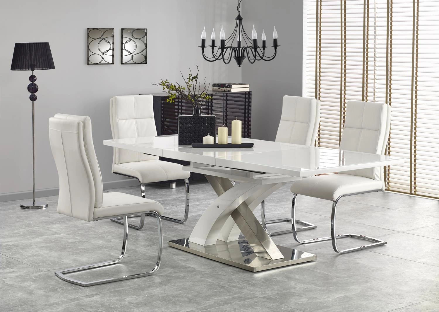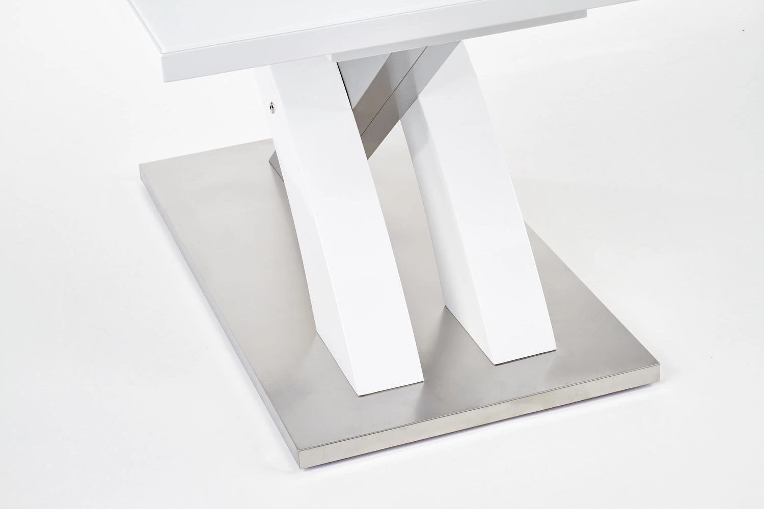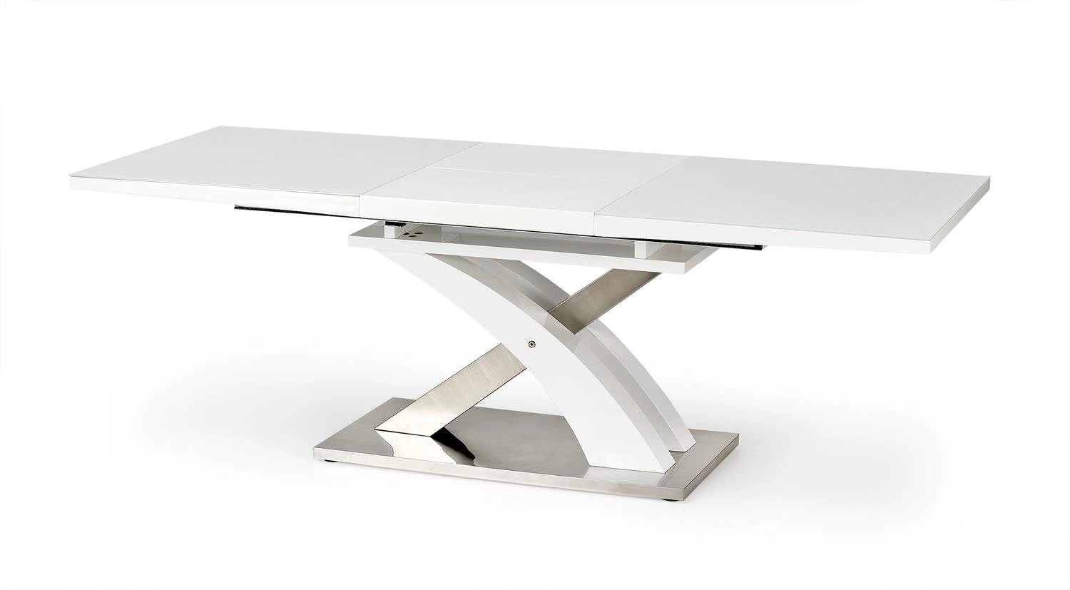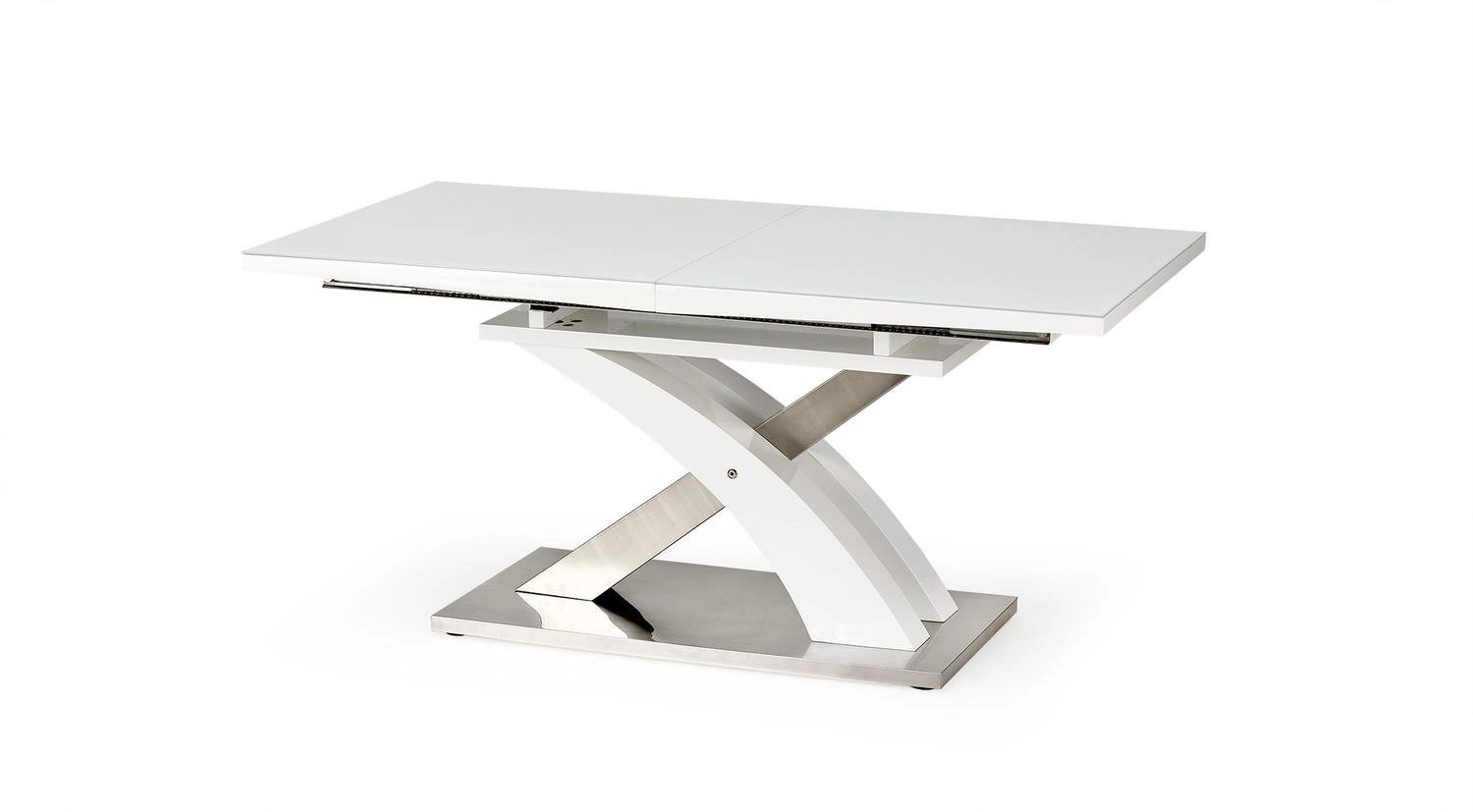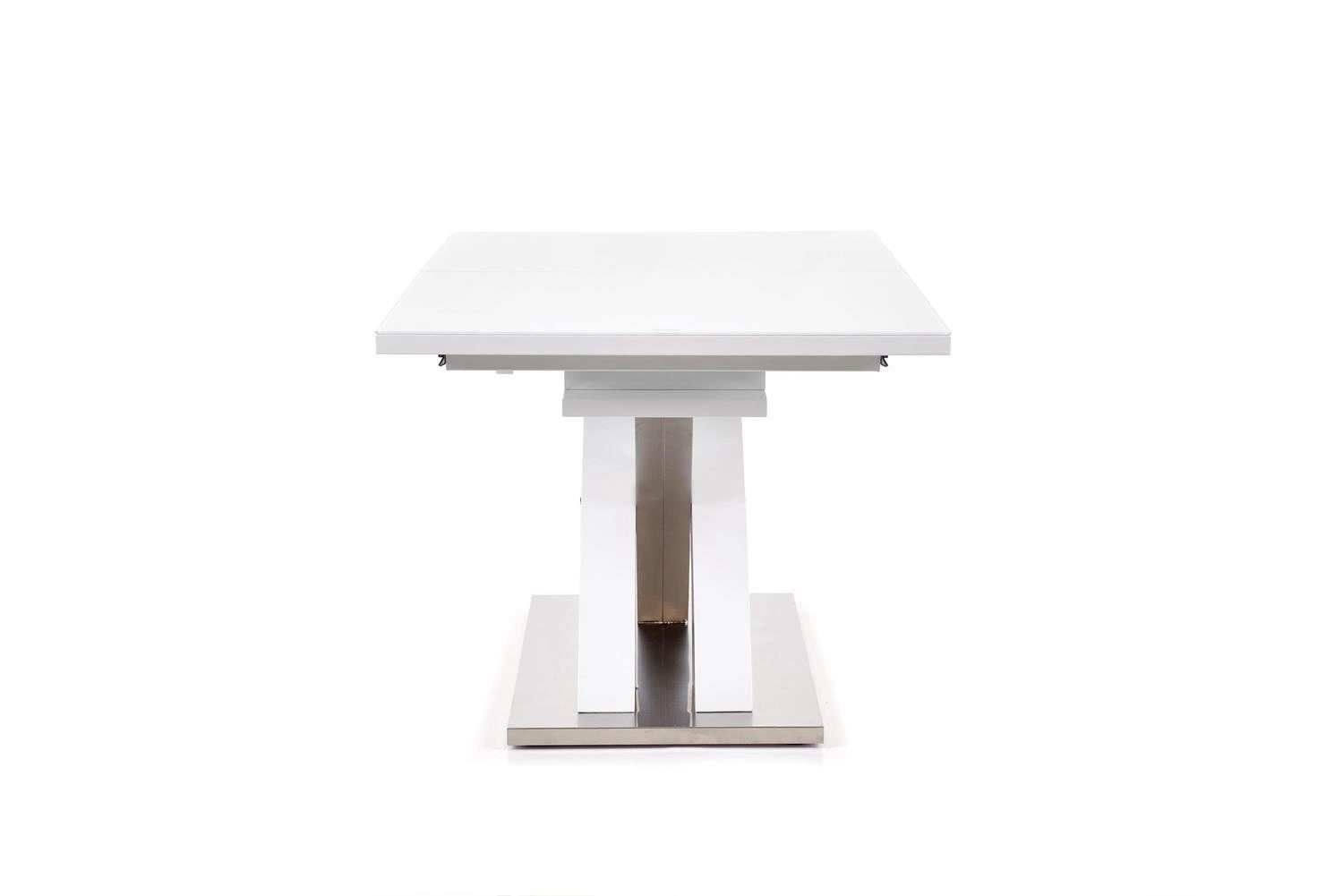 Obdélníkový rozkládací stůl Doran vyniká moderním designem a elegantní bílou skleněnou deskou. Lesklý povrch nejen krásně odráží světlo, ale zároveň umožňuje snadné čištění po každém jídle – stačí setřít desku a stůl opět září čistotou. Jemné spojení skla a lakované desky vytváří stůl, který skvěle doplní interiéry v glamour stylu i minimalistickém provedení.
