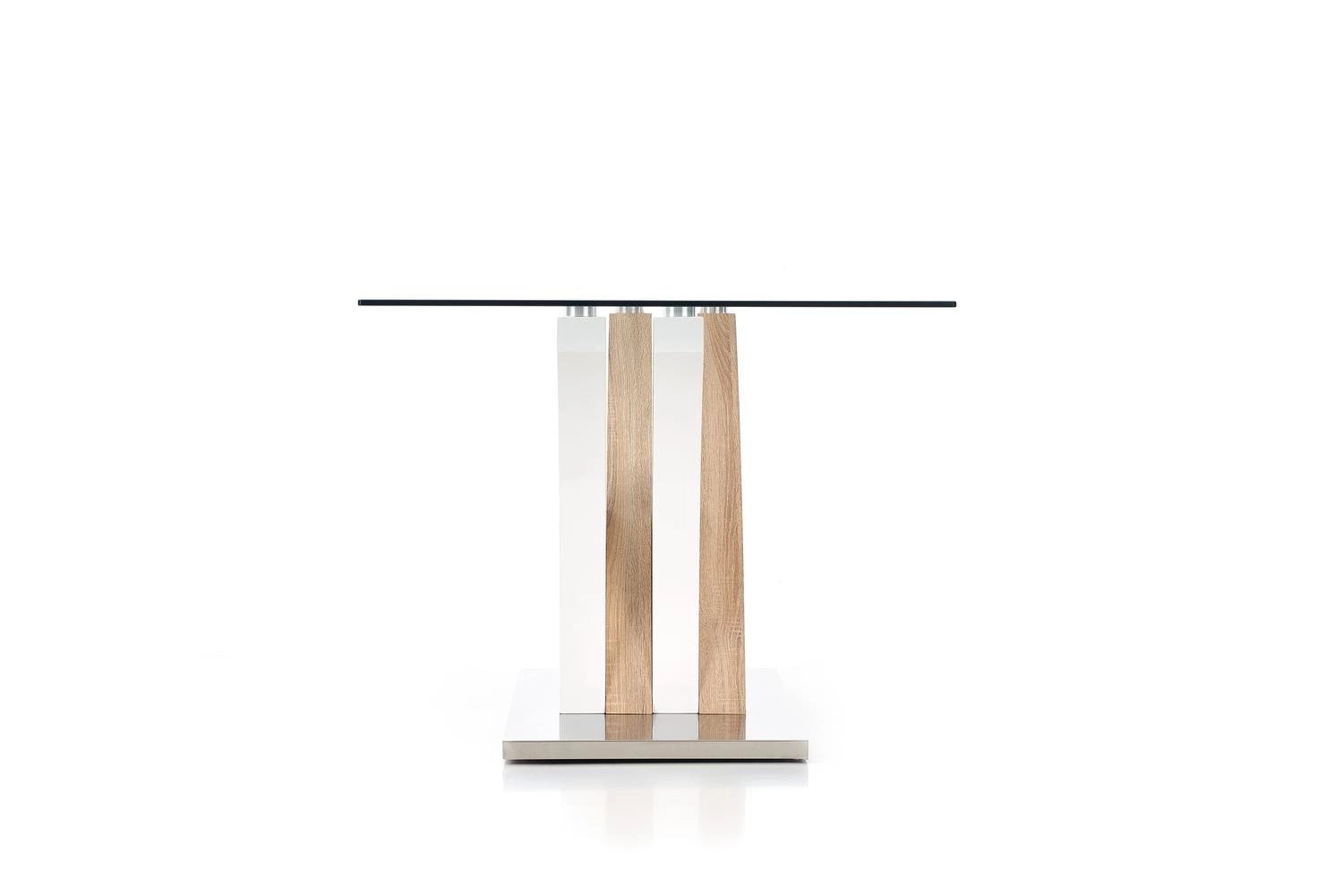 Silnou stránkou stolu Virem je originální estetika. Kombinace průhledného skla s přirozeným odstínem dubu sonoma a bílými detaily dokonale odpovídá současným interiérovým trendům. Jemné barevné ladění usnadňuje sladění stolu s různými styly – od minimalistických až po skandinávské interiéry. Kovová konstrukce zajišťuje stabilitu a zároveň dodává lehký industriální nádech, který skvěle vynikne v otevřených kuchyních nebo obývacích pokojích s jídelní částí.