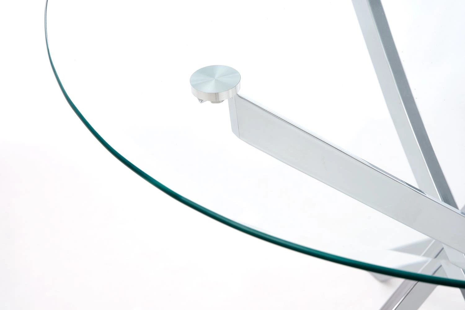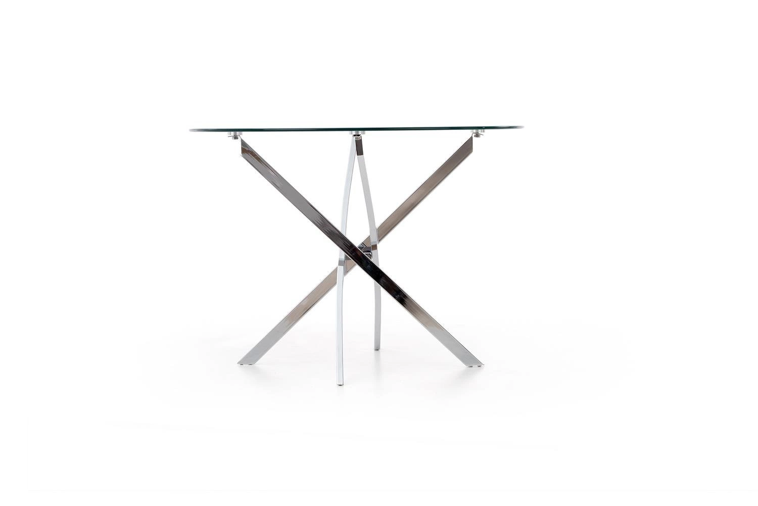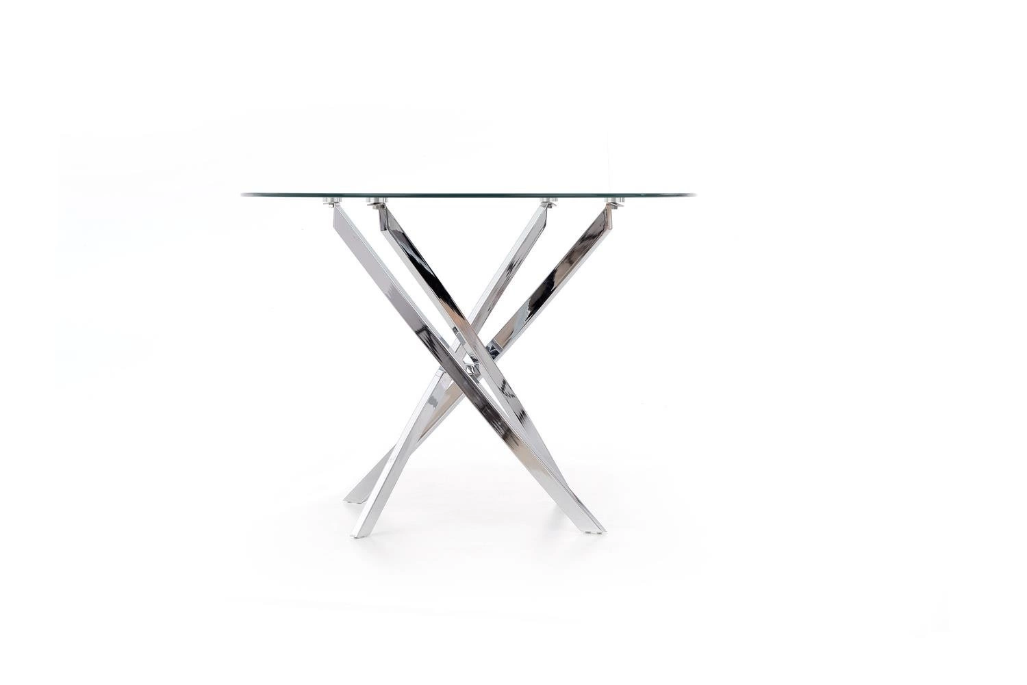 Kulatý skleněný stůl Amber od značky Intesi je ideální volbou pro milovníky moderních a elegantních interiérů. Kulatá deska o průměru 100 cm z čirého skla a čtyři kovové nohy s chromovanou povrchovou úpravou vytvářejí lehký, ale výrazný prvek do jídelny nebo kuchyně. Tento nerozkládací stůl spojuje minimalistický design s funkčností a poskytuje pohodlné místo až pro čtyři osoby.