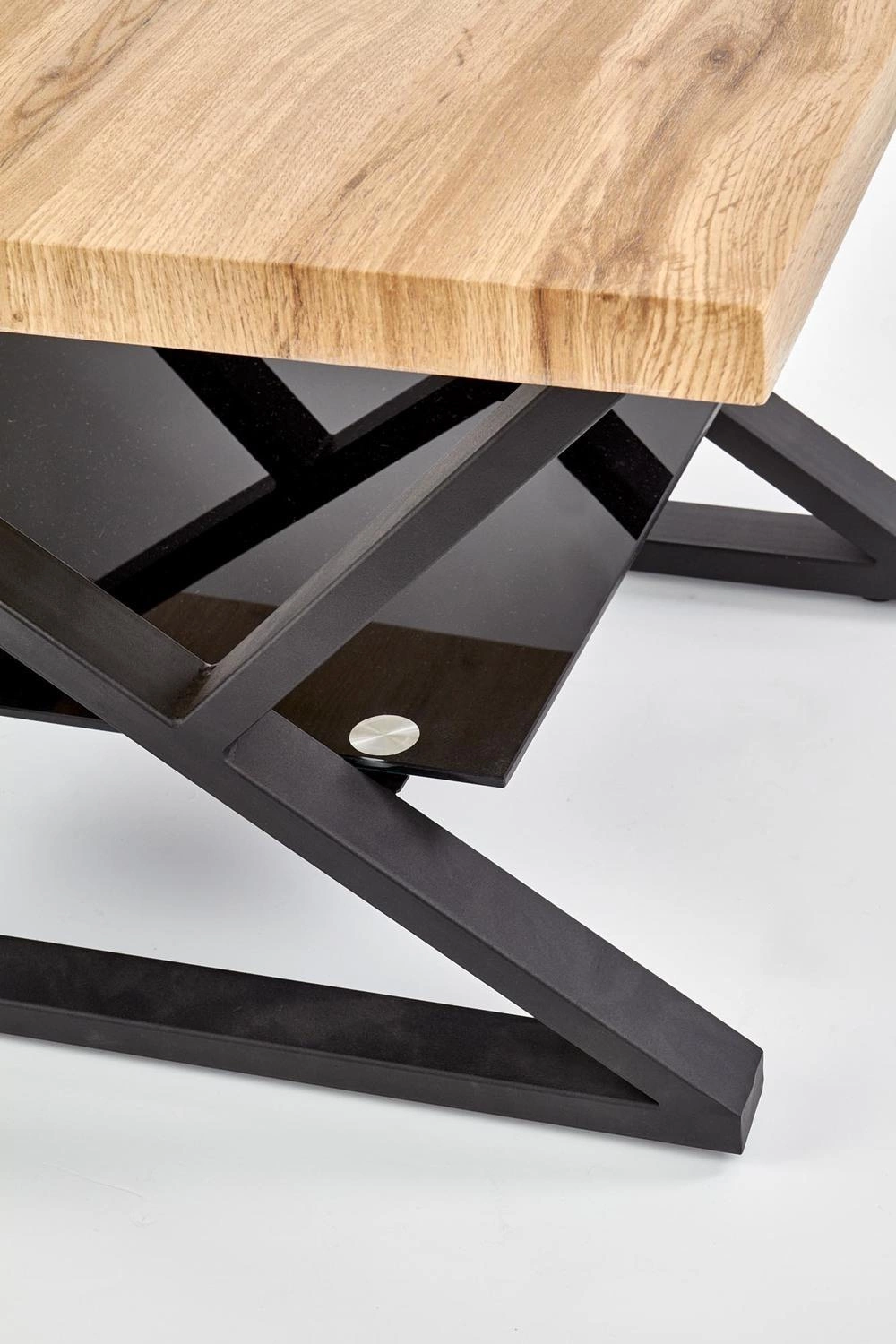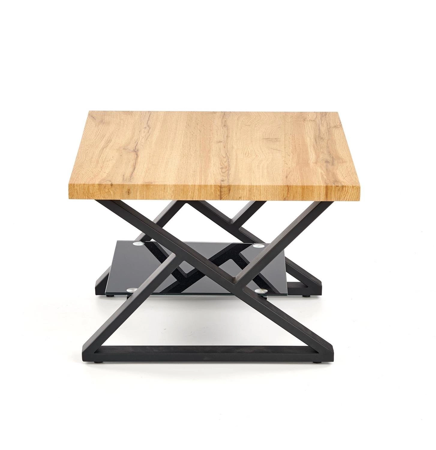 Konferenční stolek Venom Cristal S od značky Intesi je spojením moderního designu, praktičnosti a industriálního stylu. Čtvercová deska o rozměrech 60x60 cm v přírodním dubovém dekoru, pevná ocelová konstrukce v hluboké černi a doplňková skleněná police dělají z tohoto stolku ideální volbu do obývacího pokoje, kanceláře nebo ložnice. Tento moderní konferenční stolek zaujme nejen svým vzhledem, ale také funkčností – bez problémů na něj položíte kávu, občerstvení, stejně jako oblíbené knihy nebo dekorace.Objevte moderní konferenční stolek do obýváku zblízka