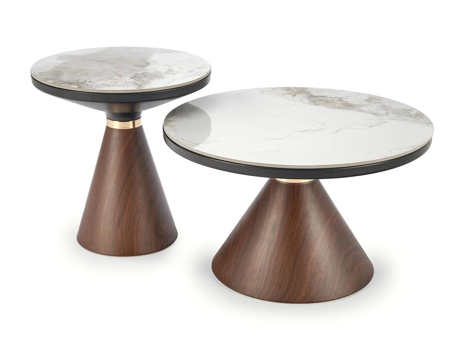 Konferenční stolek Suli kulatý bílý mramor 70 cm Intesi je stylový a moderní kus nábytku, který spojuje luxusní vzhled mramoru s odolností keramiky a elegancí ocelové podnože. Kulatá deska o průměru 70 cm je vyrobena z keramiky imitující bíly mramor, což zajišťuje nejen působivý vzhled, ale také odolnost vůči poškrábání a snadné čištění. Stabilní podnož v odstínech zlata a ořechu podtrhuje výrazný glamour styl a optimální výška 43 cm dělá ze stolku ideální volbu do obýváku, ložnice nebo domácí kanceláře.Poznejte moderní konferenční stolek do obývacího pokoje