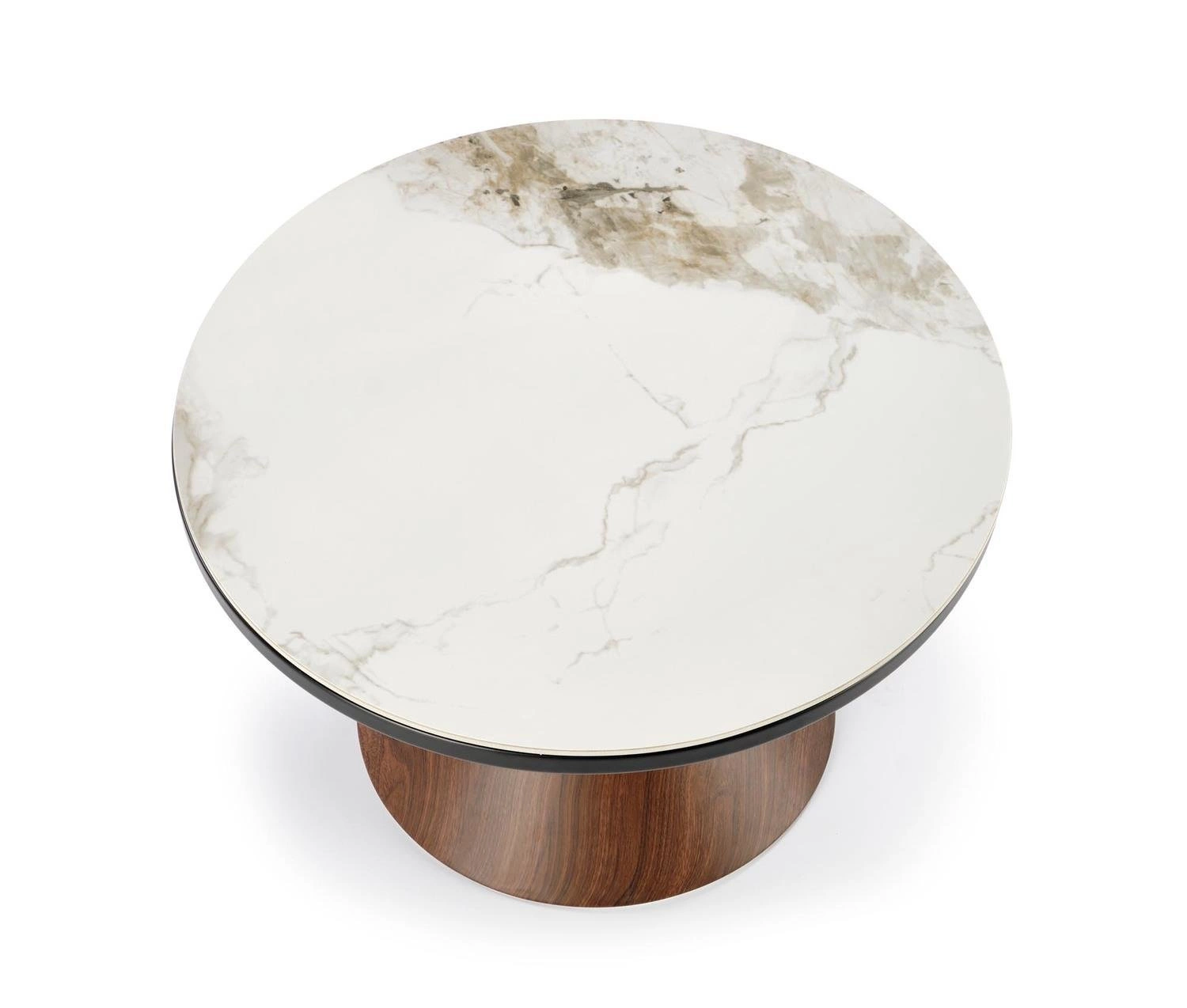 Konferenční stolek Suli je skvělou volbou pro ty, kteří oceňují funkčnost i vytříbený design. Kulatá keramická deska s matným i lesklým povrchem působí velmi noblesně a věrně imituje přírodní bílý mramor. Perfektně se hodí jak do glamour interiérů, tak do moderních minimalistických prostor. Ocelová podnož v tmavě ořechovém a zlatém tónu dodává nábytku luxusní charakter a zajišťuje stabilitu i při každodenním používání.Design, který zvýrazní jedinečný styl vašeho domova